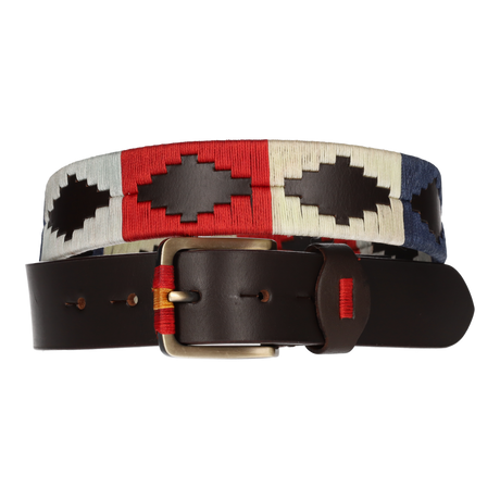 Cinturón marrón bordado azul, rojo y beige