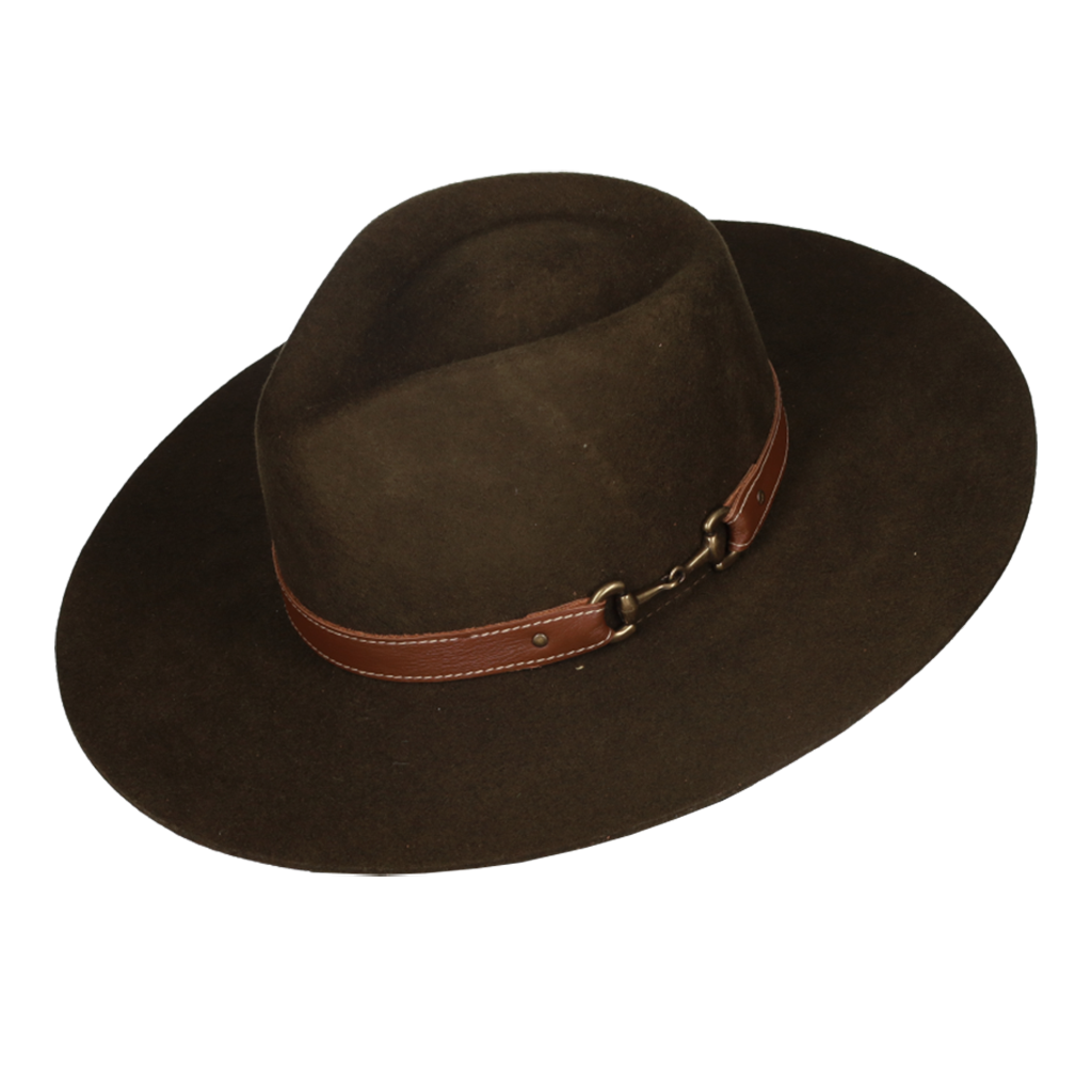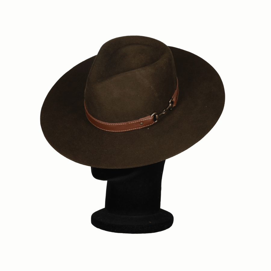 Sombrero, tipo americano, de lana en color verde y con adorno de filete en cuero.