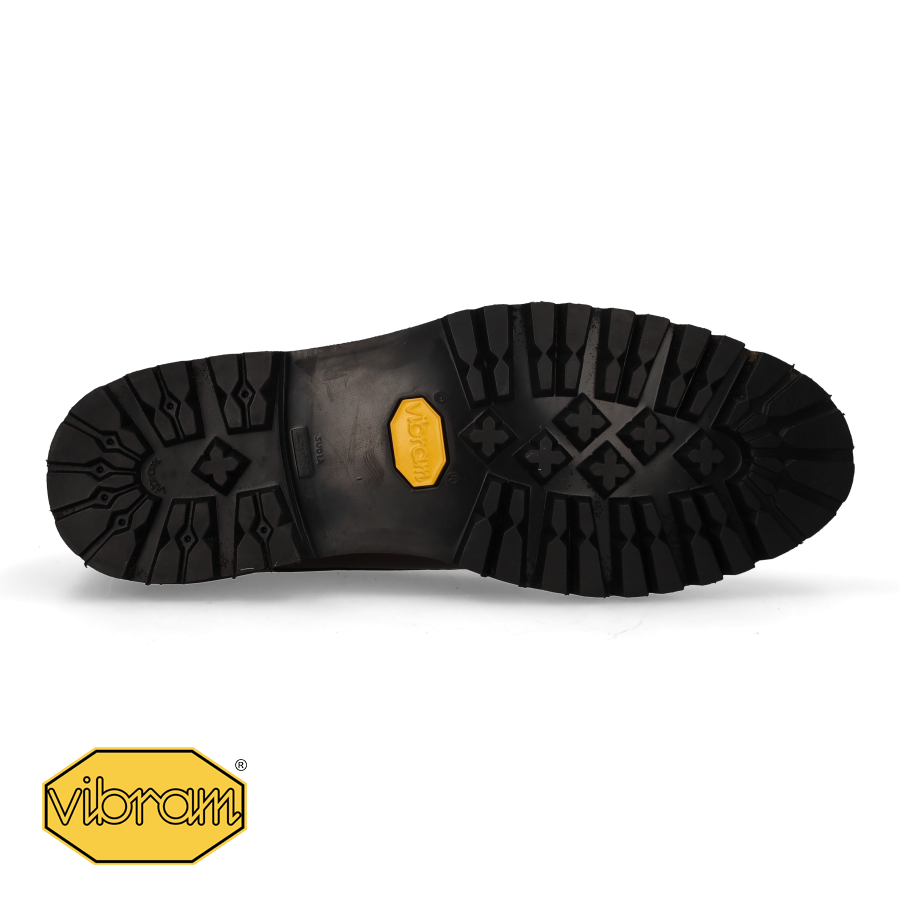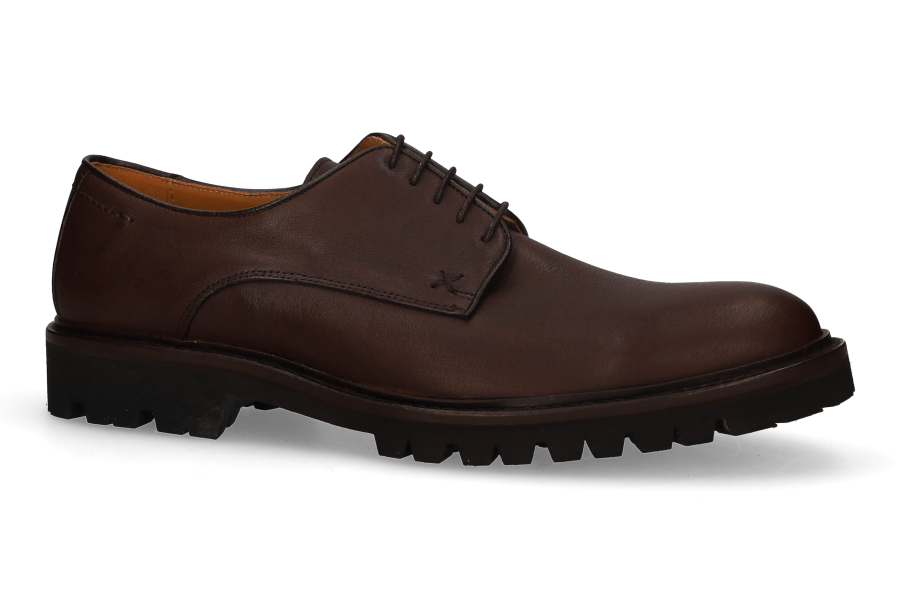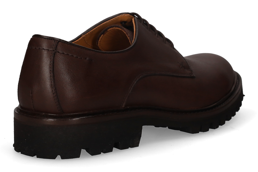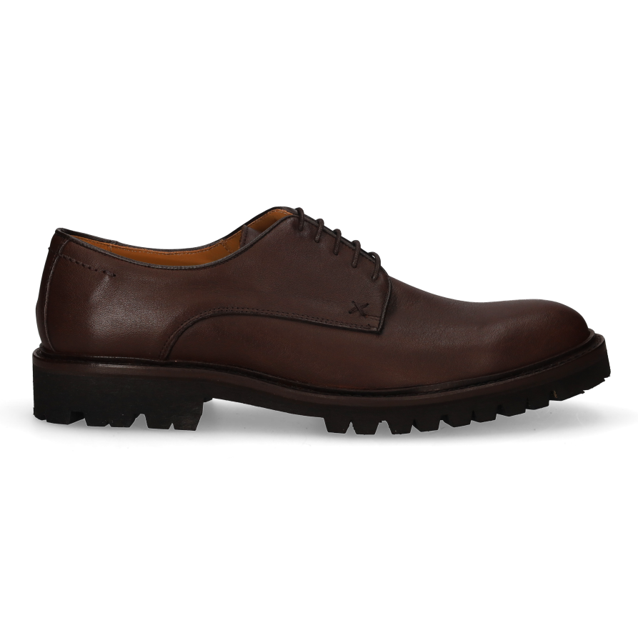 Lace-up shoe, blucher style, in mocha-colored Rocky leather. Vibram mountain sole.