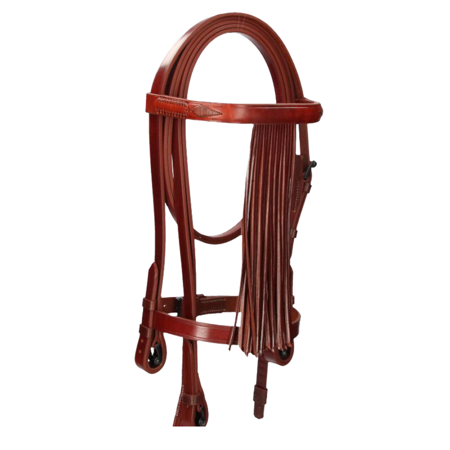 Arabian cowboy headstall with no-choke spurs, made entirely by hand by our artisans. Smooth texture, leather-colored, Arabian domed browband with no-choke spurs and a leather fly-tie, knotted reins, and blackened iron buckles.