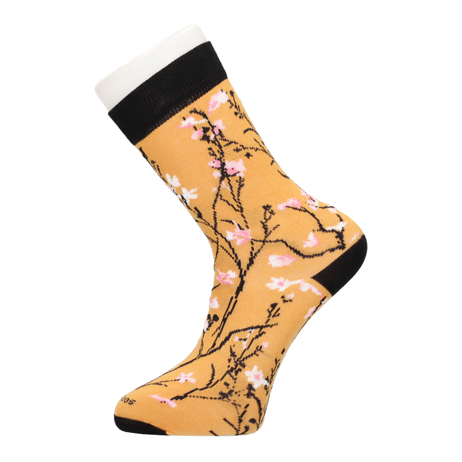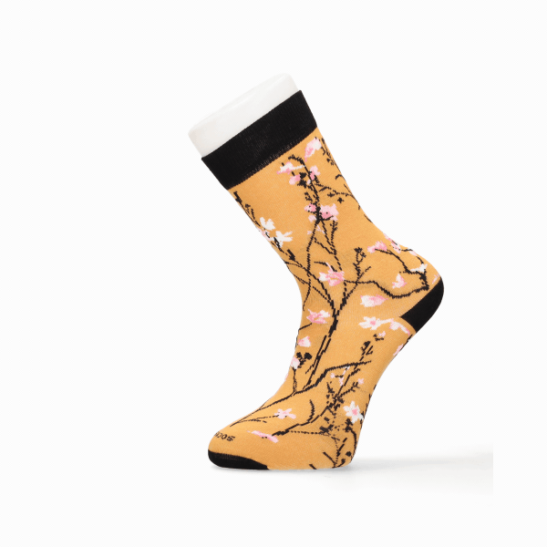 Calcetín de color mostaza con adorno de flores vintage. Oferta 3 x 2. Talla M (35-40) y talla G (41-46)