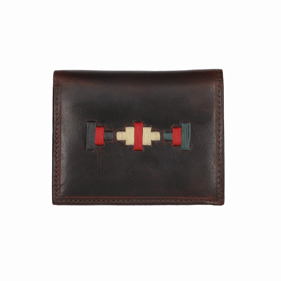 Leather wallet with ethnic embroidery in blue, red, beige, and green. It has several card slots inside.