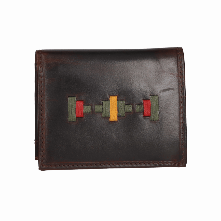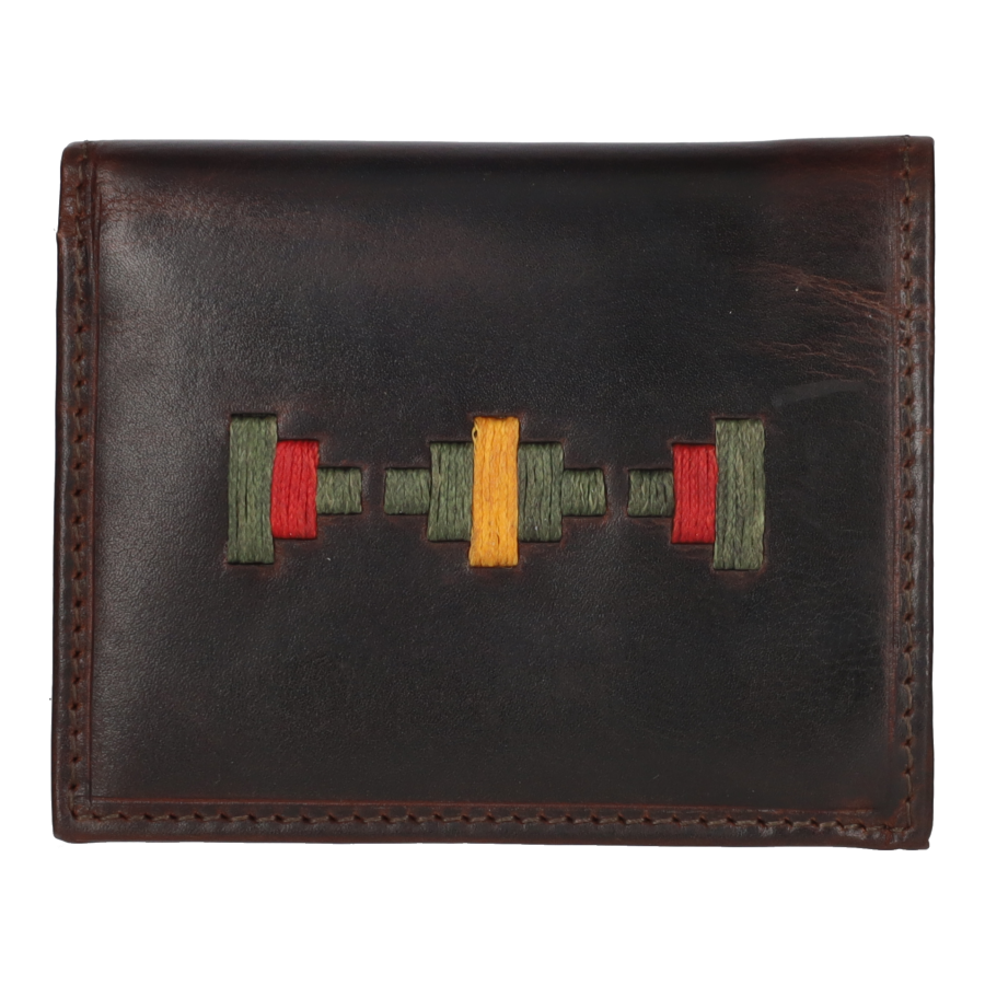 Leather wallet with ethnic embroidery in green, red, and mustard colors. It has several card slots inside.
