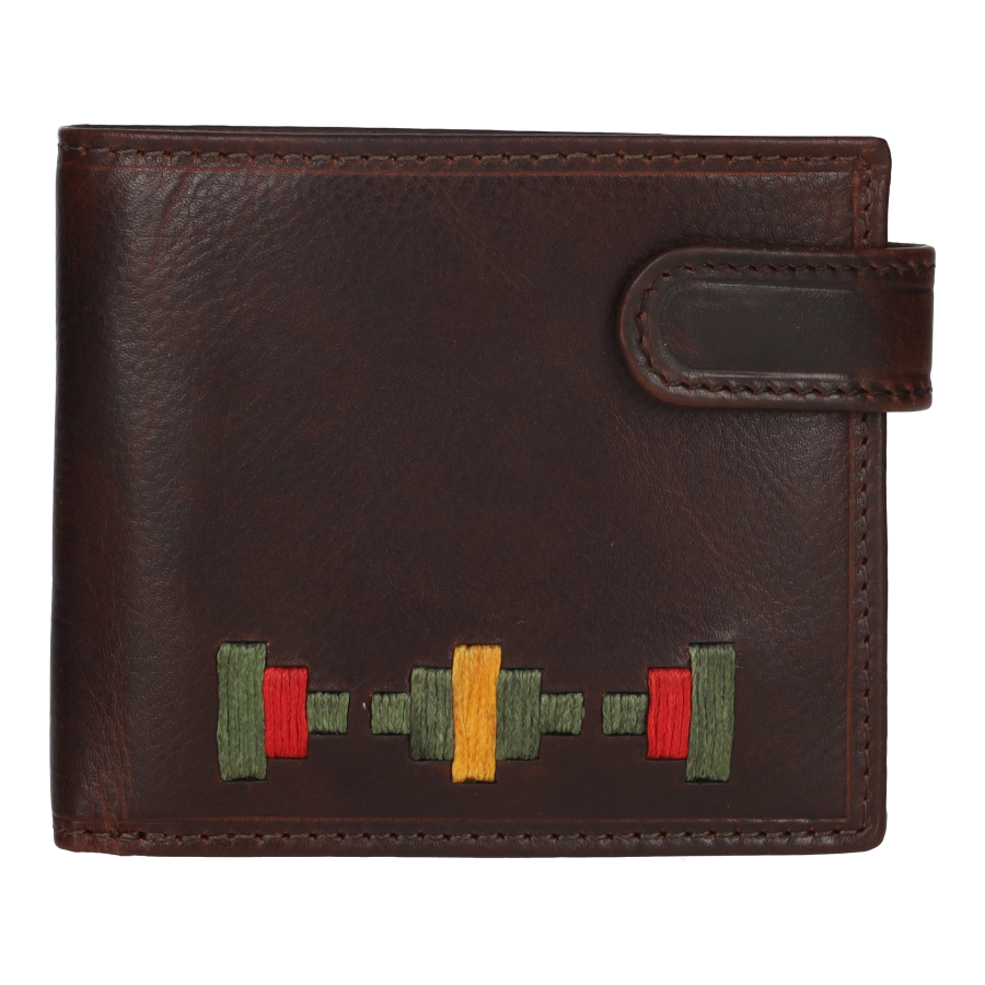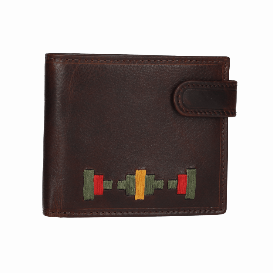 Horizontal leather wallet with ethnic embroidery in green, red, and mustard colors and a snap closure. Inside, it has several card slots and a coin purse with a snap closure.