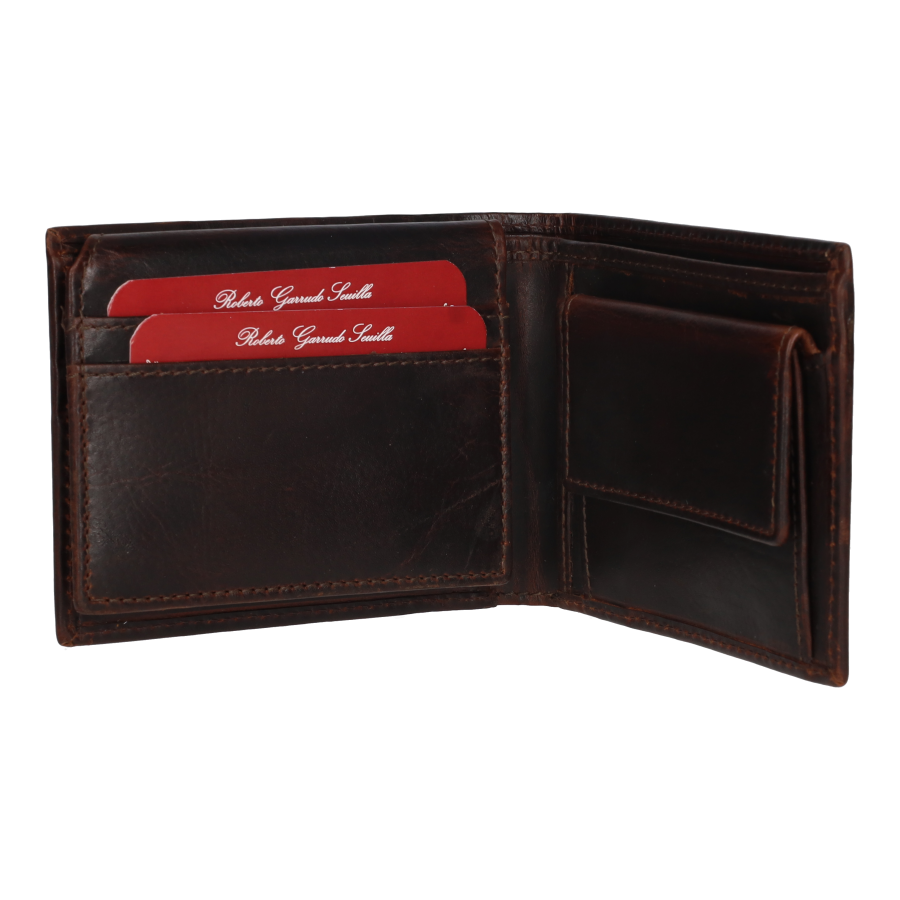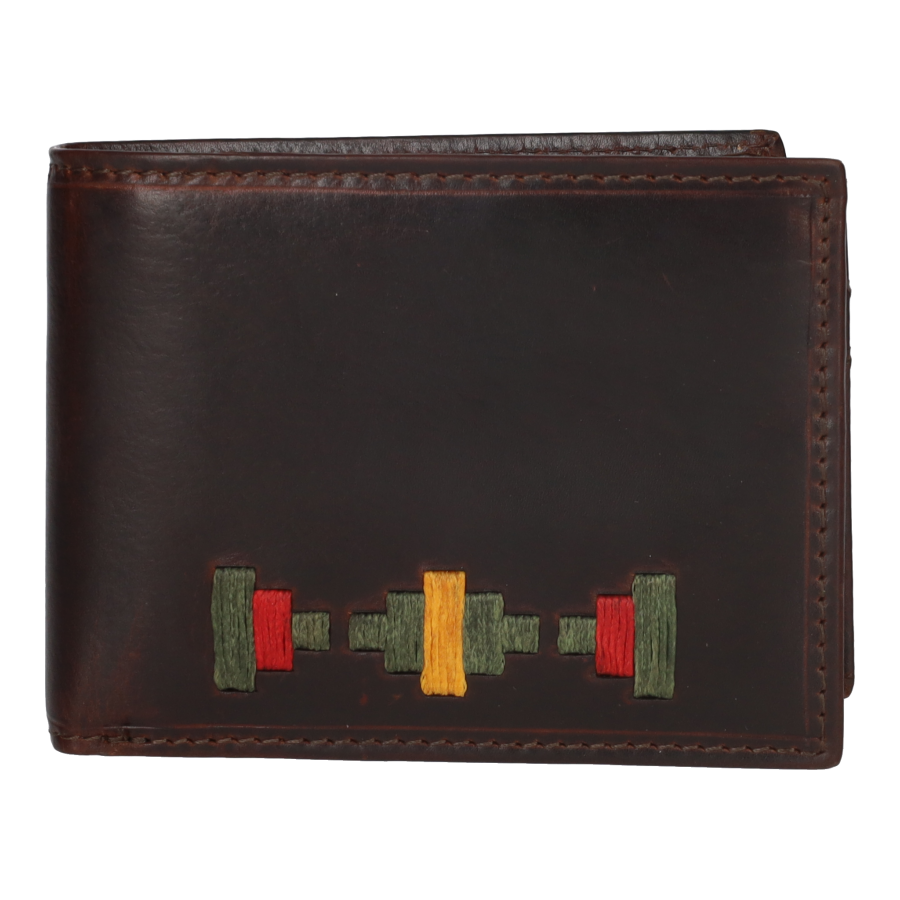 Leather wallet with ethnic embroidery in green, red, and mustard. Inside, it has several card slots and a coin purse with a snap closure.