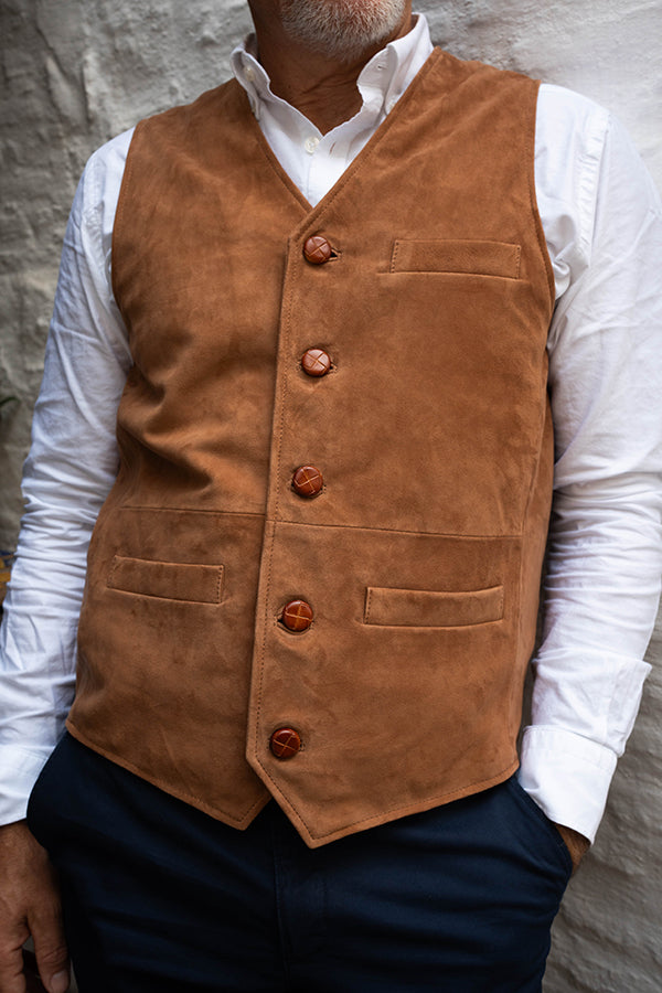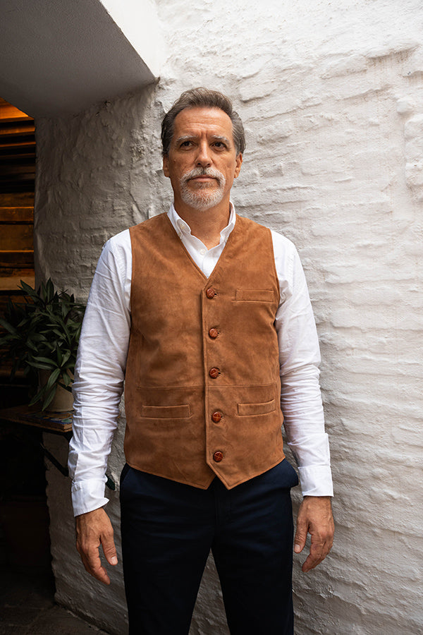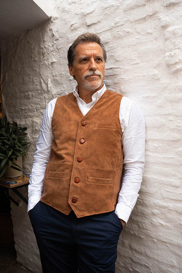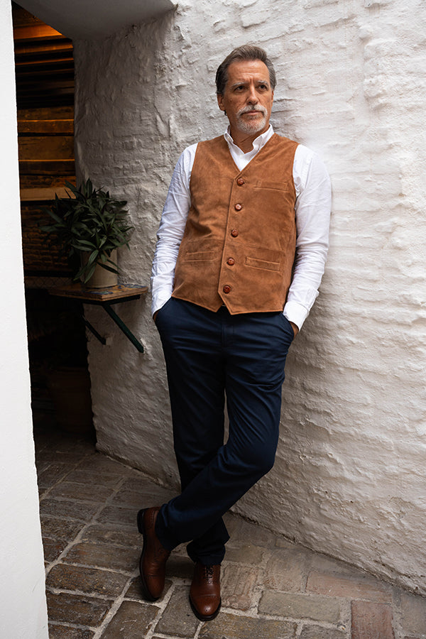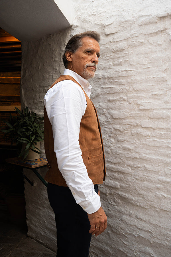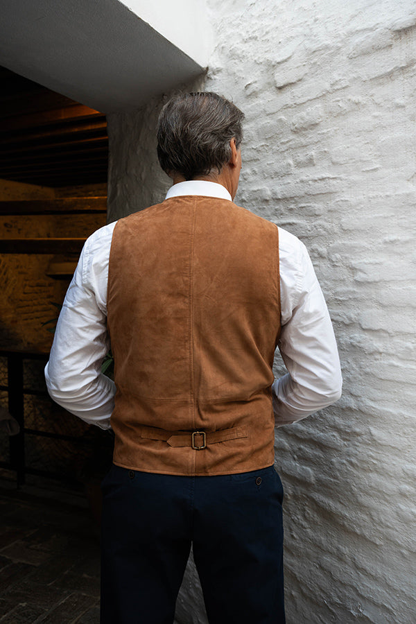 Chaleco de caballero, de piel vuelta, en color camel.