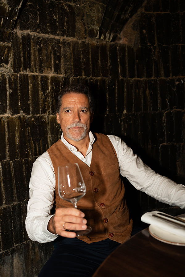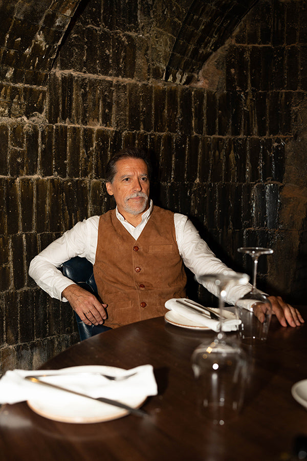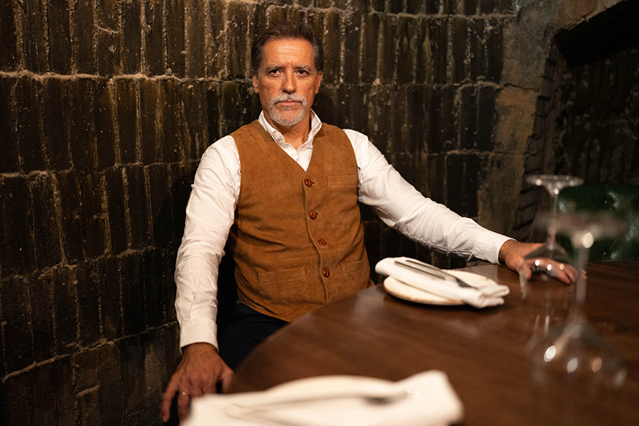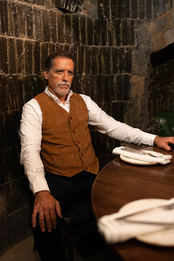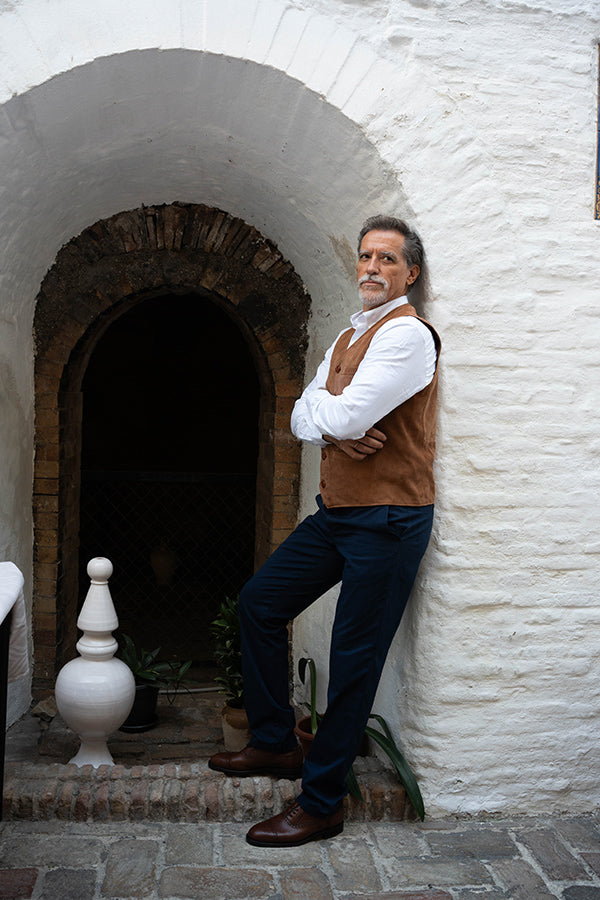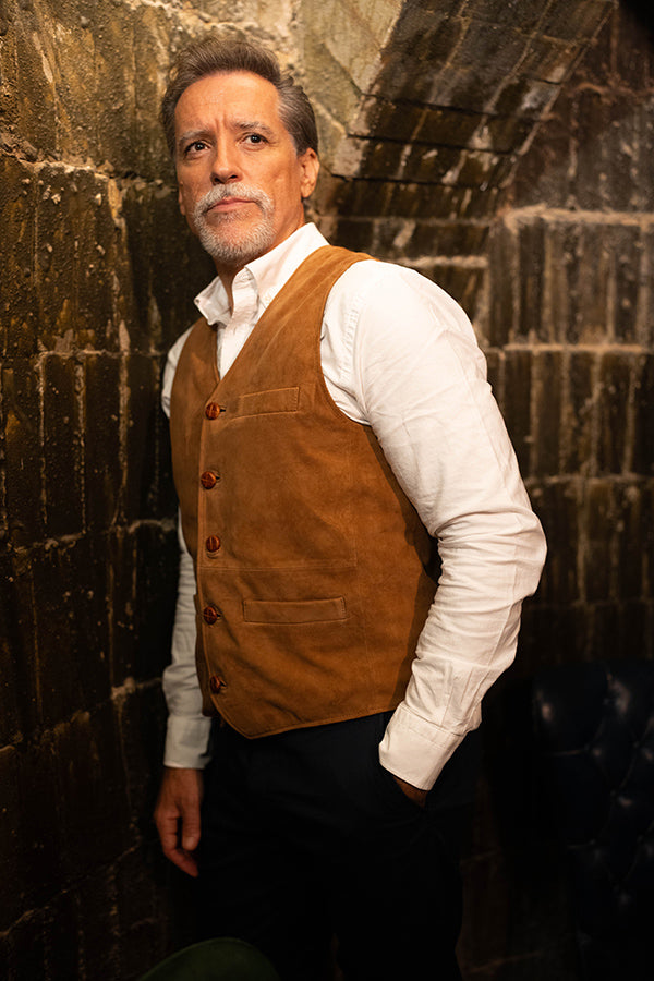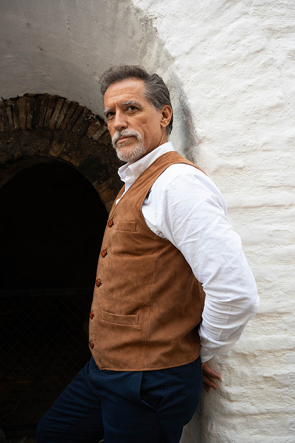 Chaleco de caballero, de piel vuelta, en color camel.