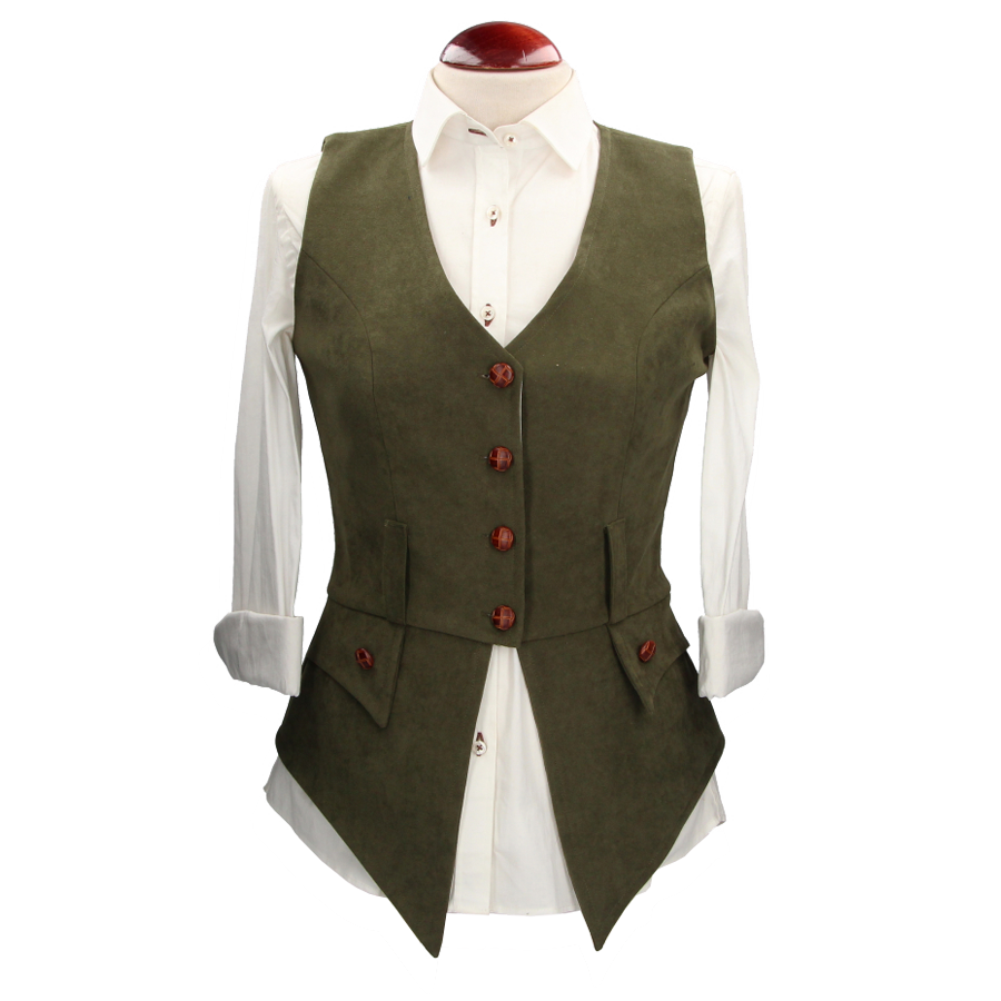 Women's vest, by Claudia Baelo, Diana model, suede fabric, green. With belt loops. Button closure. Ruffled. Composition: 97% polyester, 3% spandex.