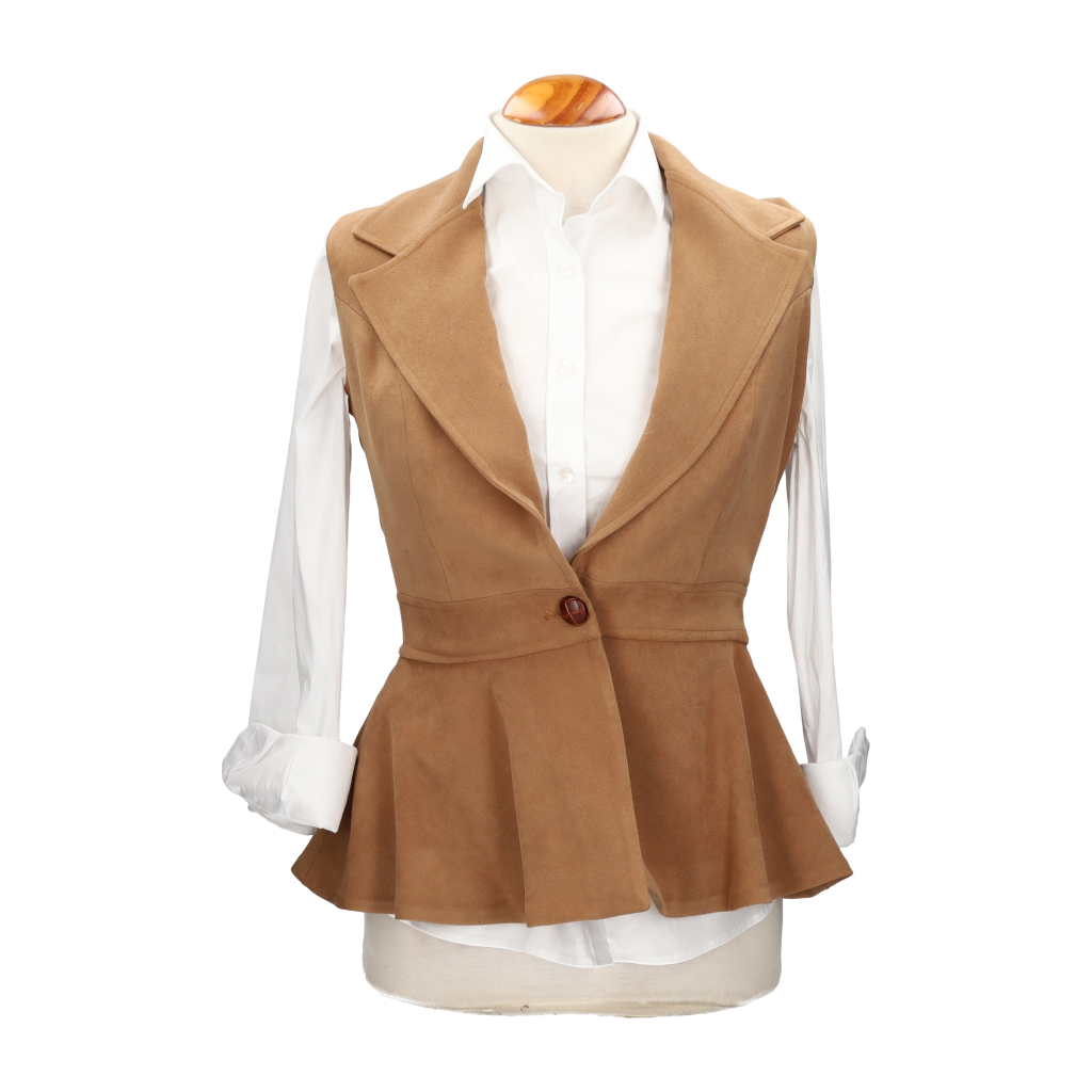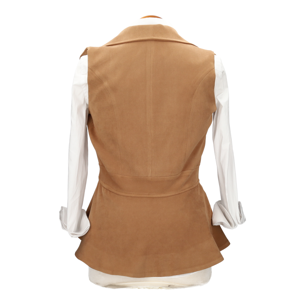 Chaleco de mujer, de la marca Claudia Baelo, modelo Oporto, en color tostado. Tejido de antelina. Cierre con botón.