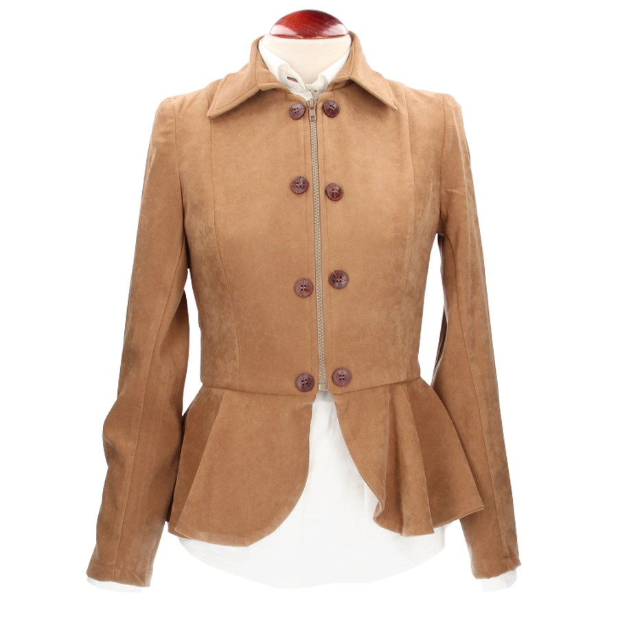 Women's jacket, by Claudia Baelo, Tavira model, in camel suede. It has a zip closure and decorative buttons on each side. The fabric is a brown blend that feels lovely against the skin and is very comfortable to wear.