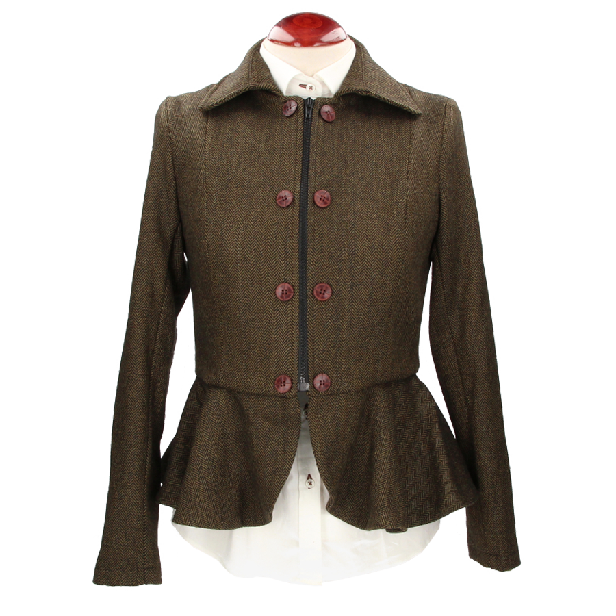 Women's jacket, by Claudia Baelo, Tavira model, in brown, herringbone fabric. It has a zip closure and decorative buttons on each side. The fabric is a green blend that is very pleasant to the touch and very comfortable to wear.