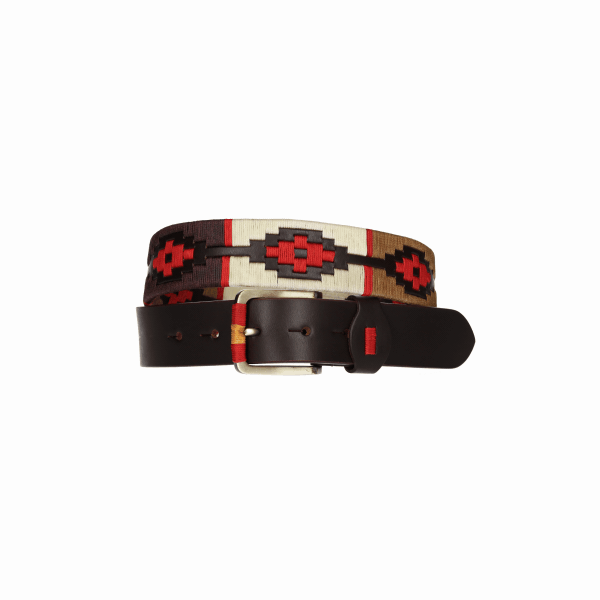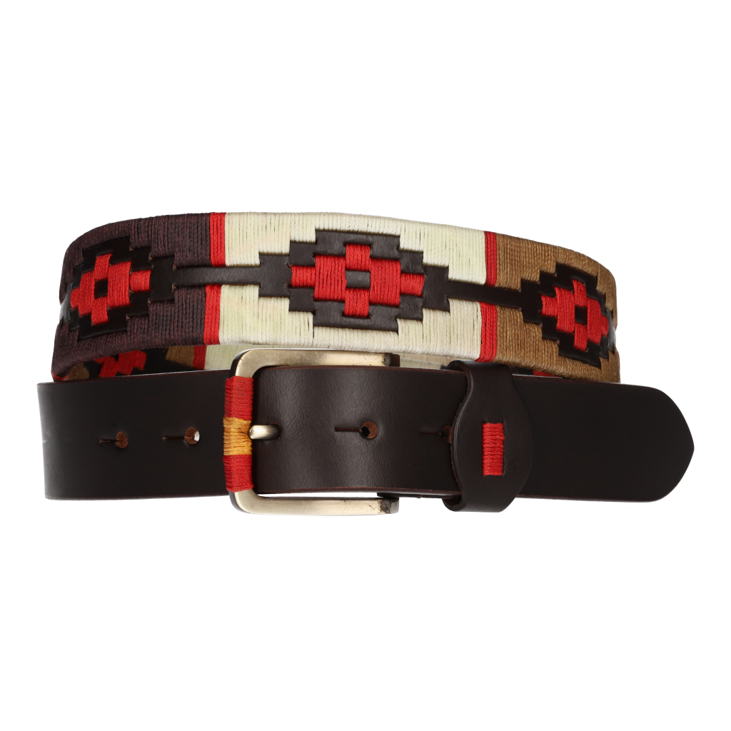 Cinturón de piel unisex con bordado en color beige, marrón y camel.