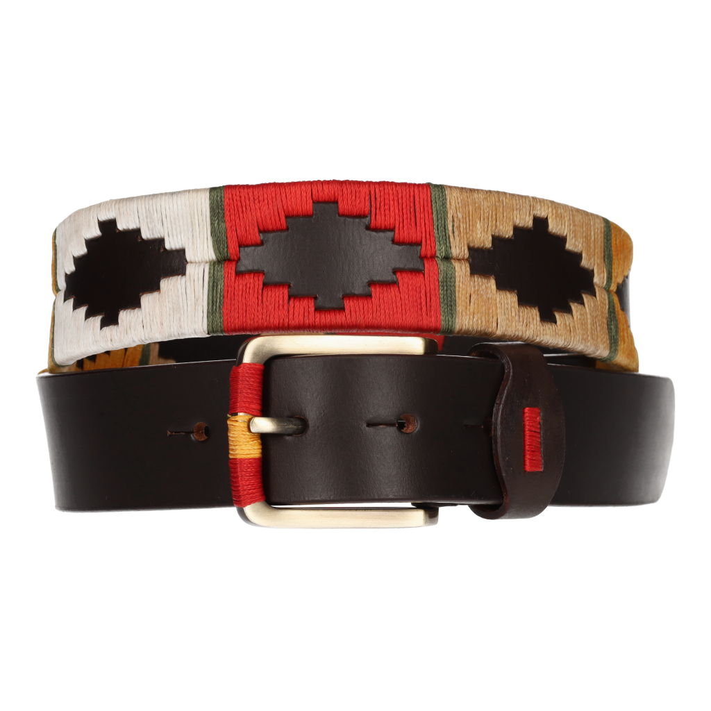 Cinturón unisex marrón bordado en color mostaza, rojo y beige.
