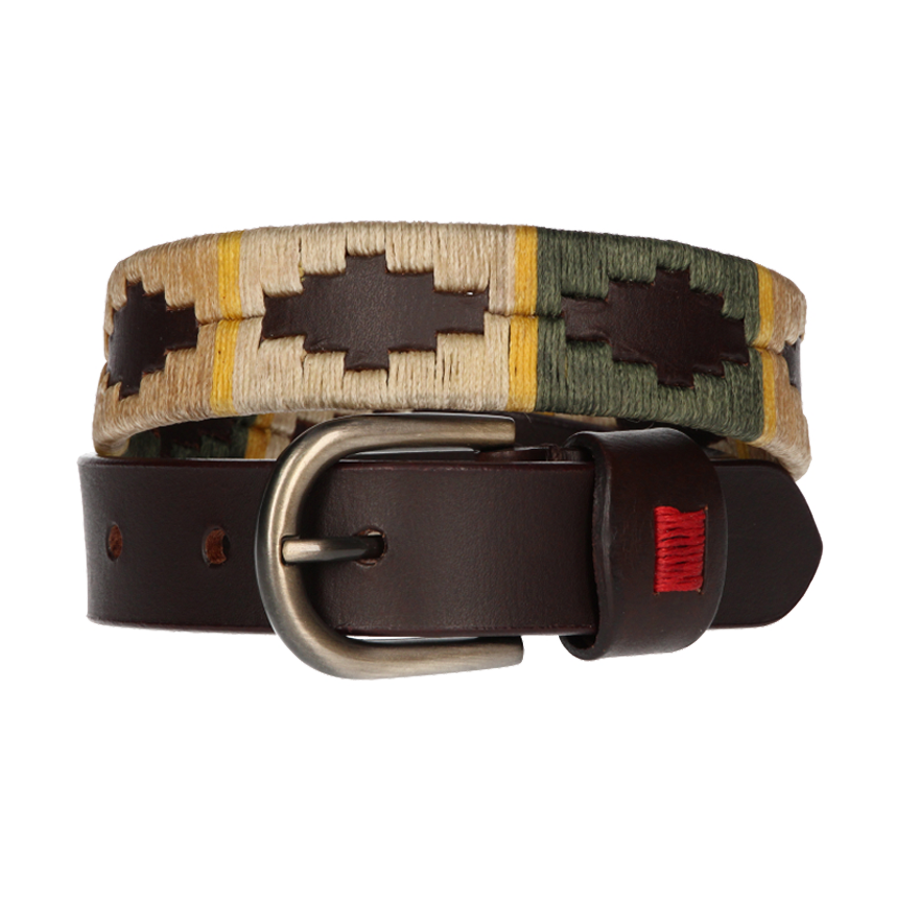 Roberto Garrudo children's belt embroidered in beige, camel and green.