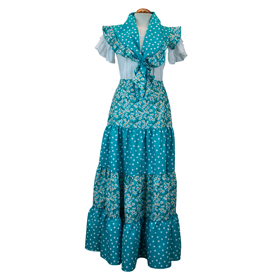 Skirt and piquillo pepper set, model "Amapola." Featuring shades of green and polka dots combined with floral details. The piquillo pepper pepper comes with a built-in bow for easy fastening without a safety pin.