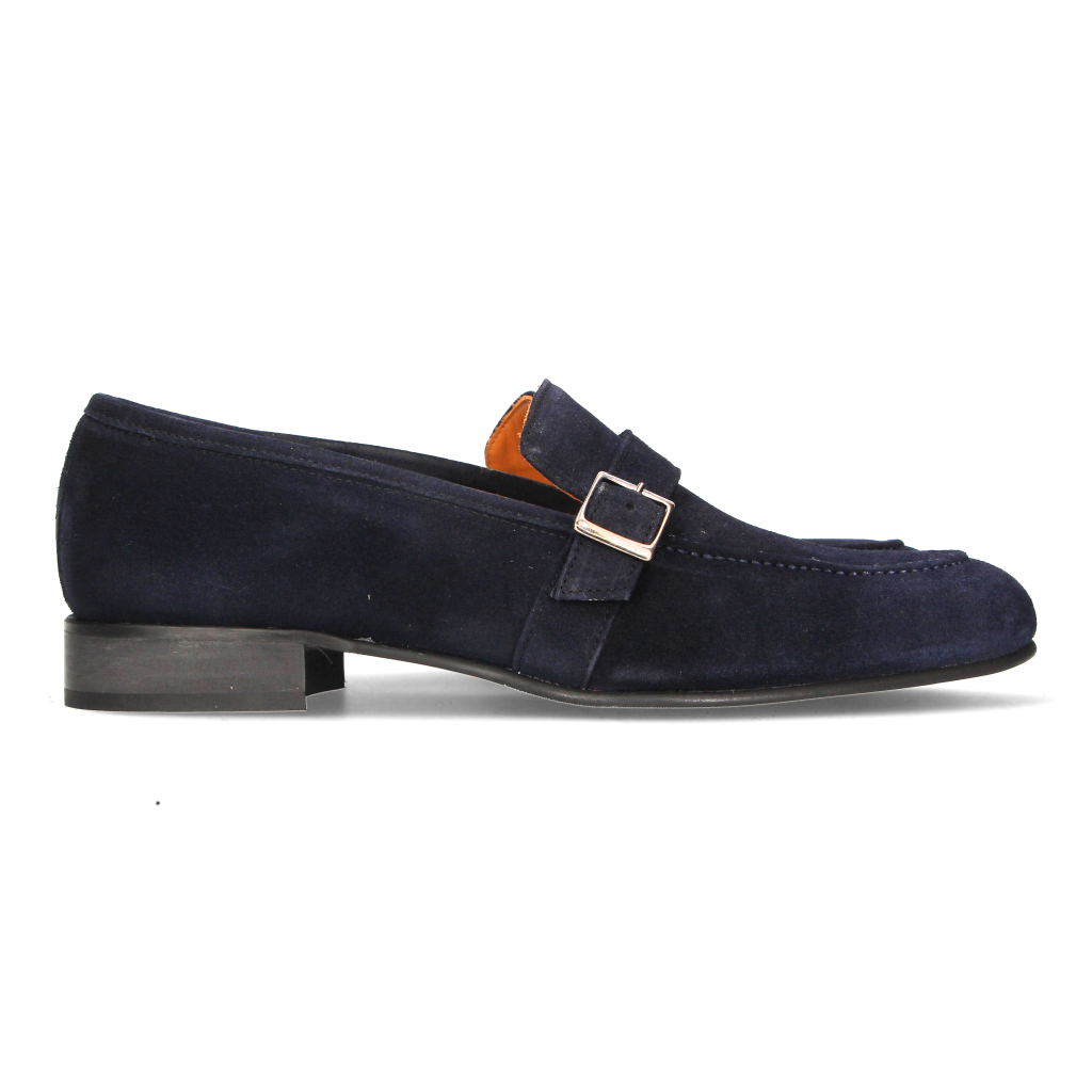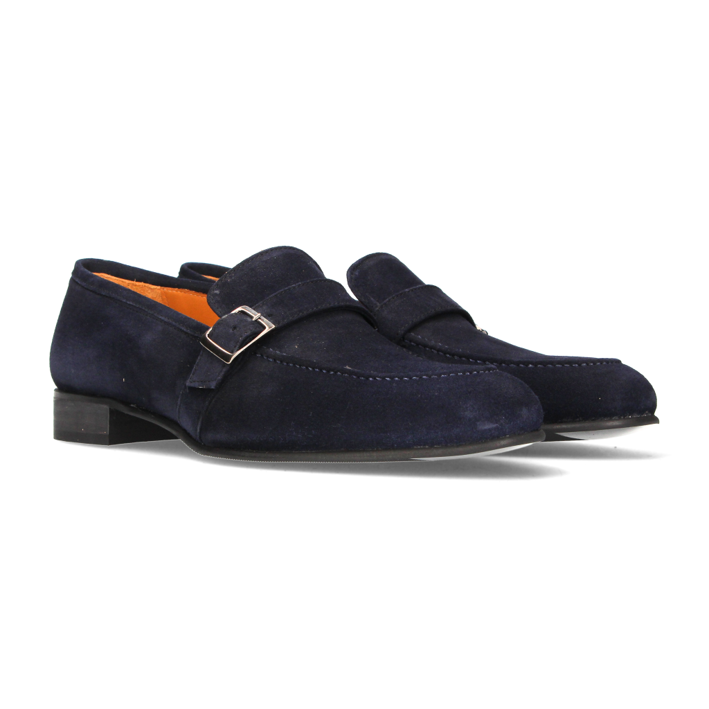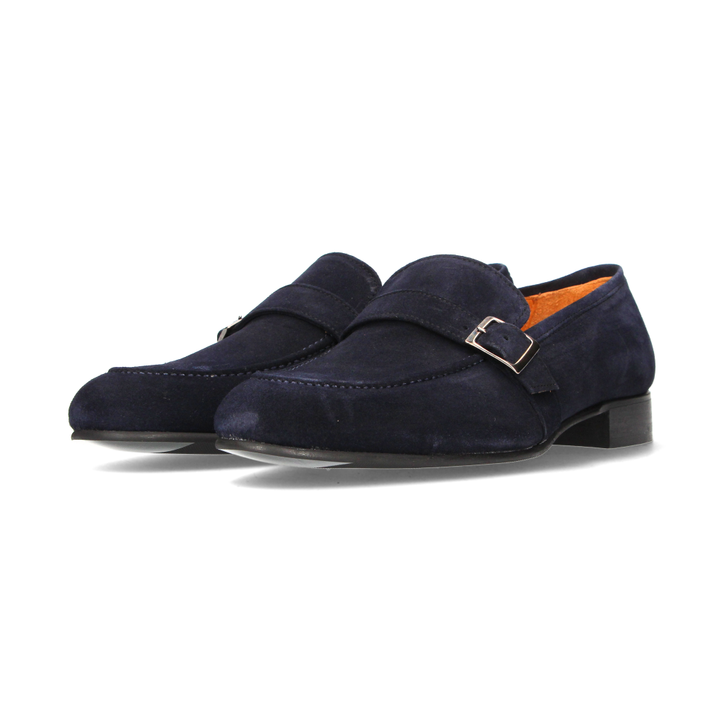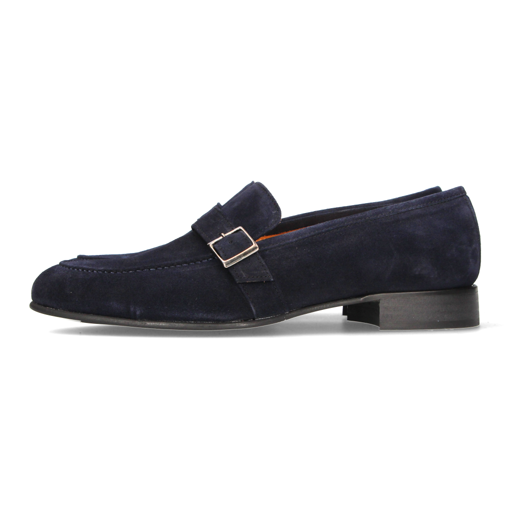 Men's shoe, top with buckle, in blue suede and leather sole