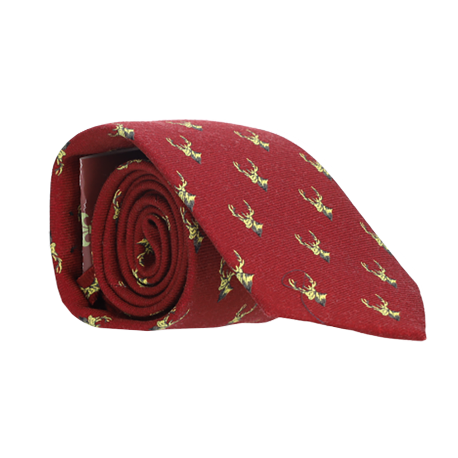 Wool tie with red background and deer ornament.