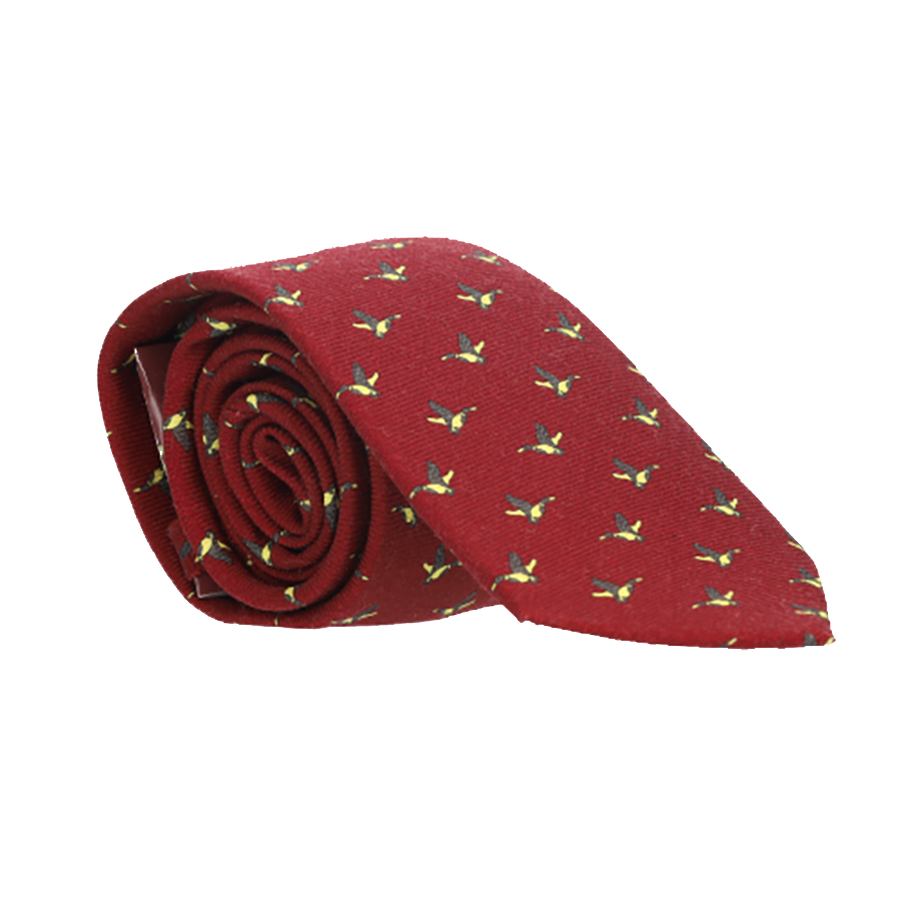 Wool tie with red background and goose decoration.