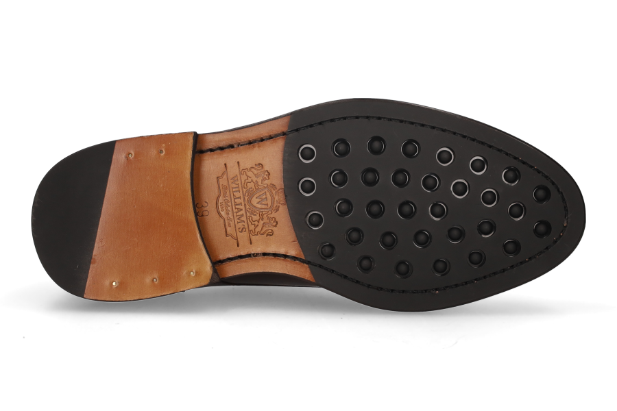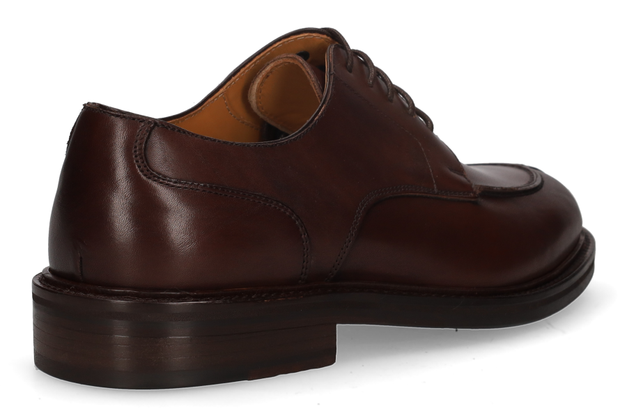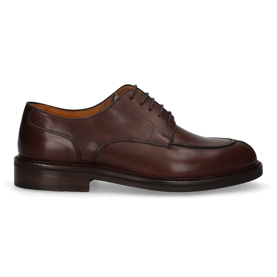 Lace-up Oxford-style shoe in brown boxcalf leather. Black injected leather sole.