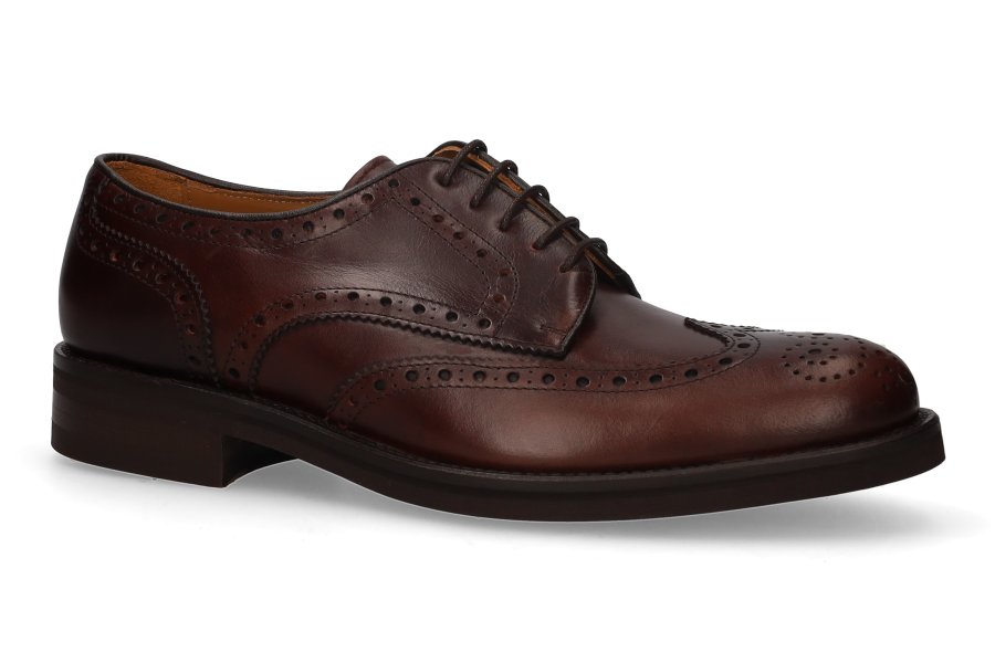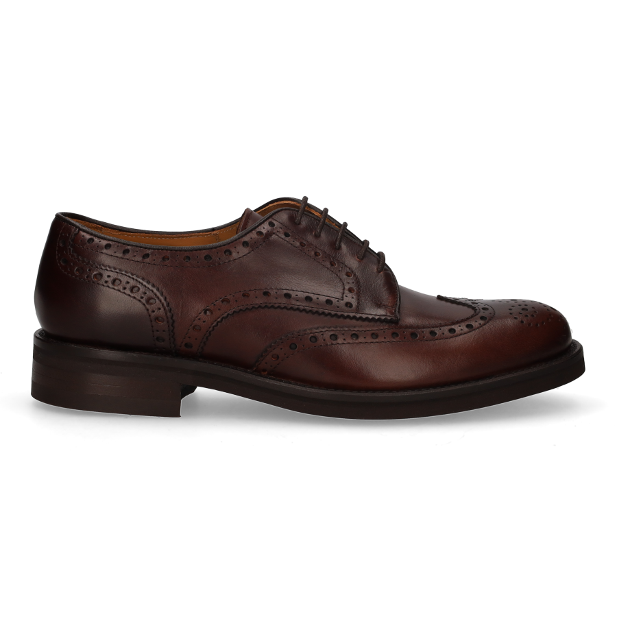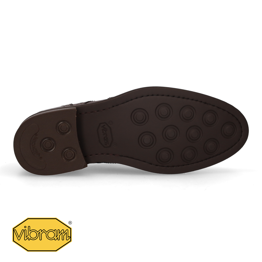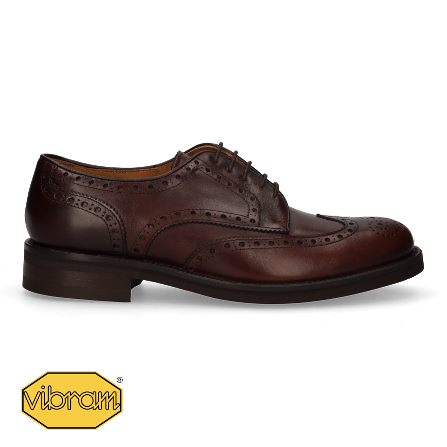 Cordovan-style Oxford shoe with a decorative vamp in brown leather. Vibram sole with buttons.