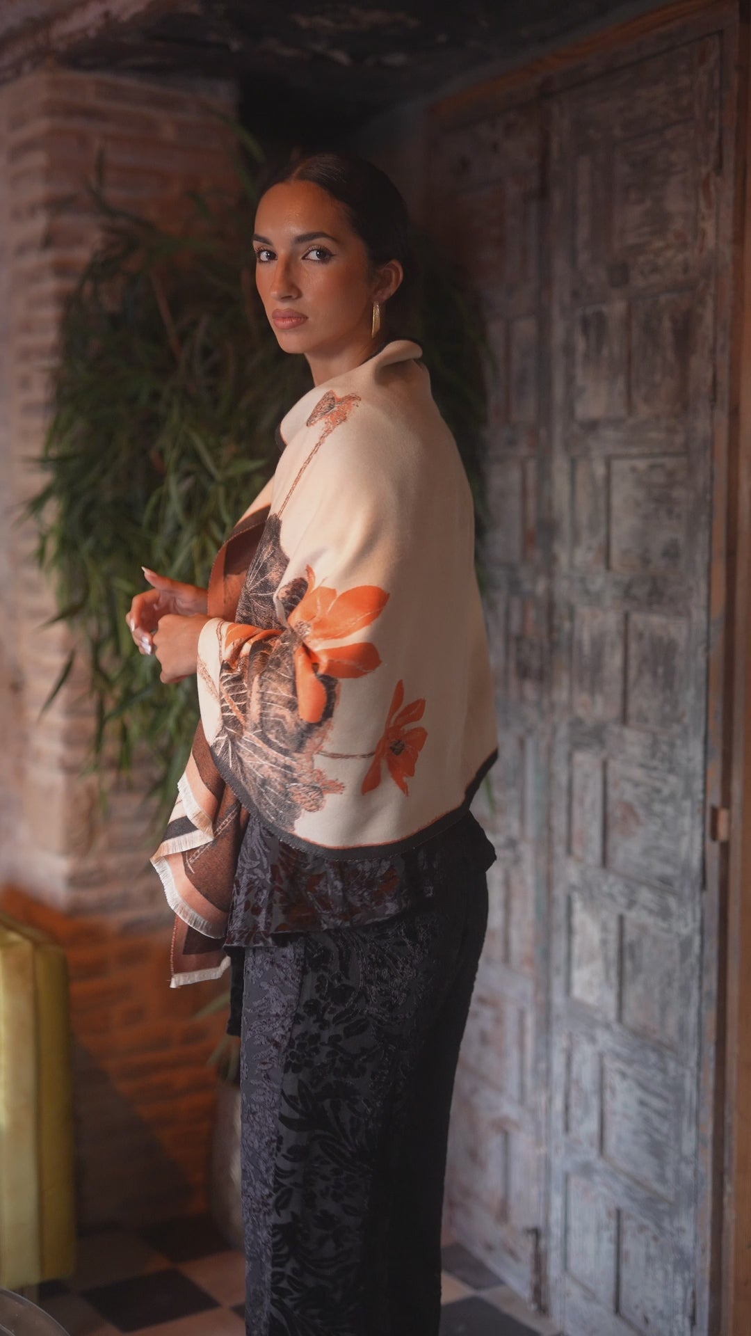 Pasmina estampado romantico en fondo crudo y flores en negro y naranja