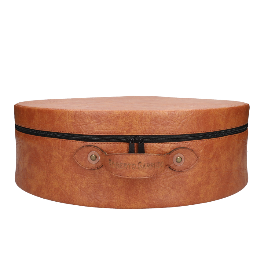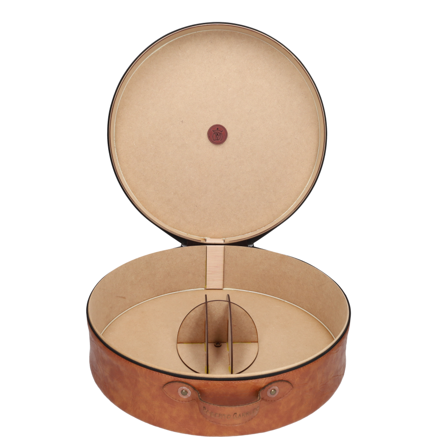 Hat box for transporting and storing hats to prevent damage. Made of wood and lined with faux leather. Dimensions: 42.5 cm.