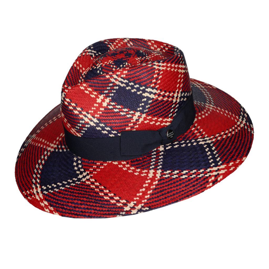 Australian hat, Juliana model, with a red and blue checkered pattern and black ribbon trim. Made of Panama. Size M, equivalent to a 57-58.