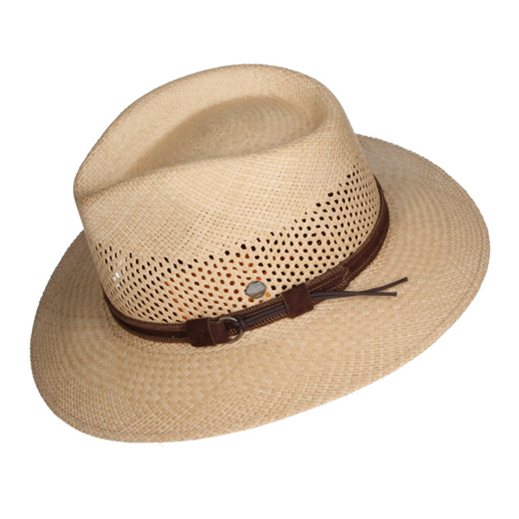 Australian hat, adorned with a brown textile ribbon. Made in Panama. Size S is equivalent to a 55-56, size M is equivalent to a 57-58, size L is equivalent to a 59-60, and size XL is equivalent to a 61-62.