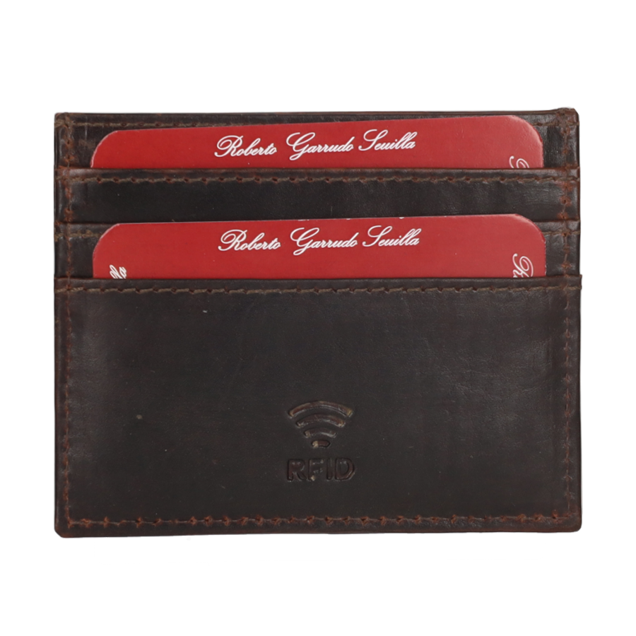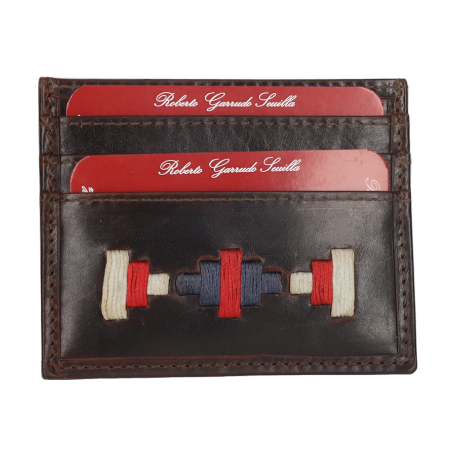 Leather card holder with ethnic embroidery in beige, red, and blue. It has several compartments inside for cards.