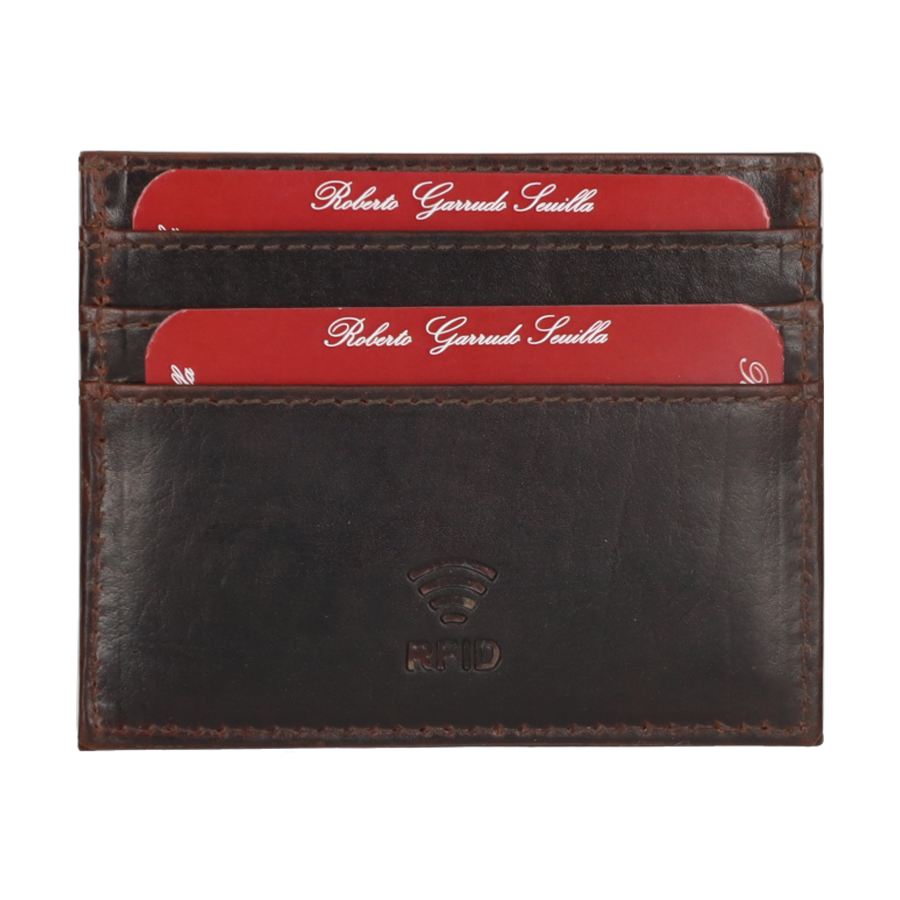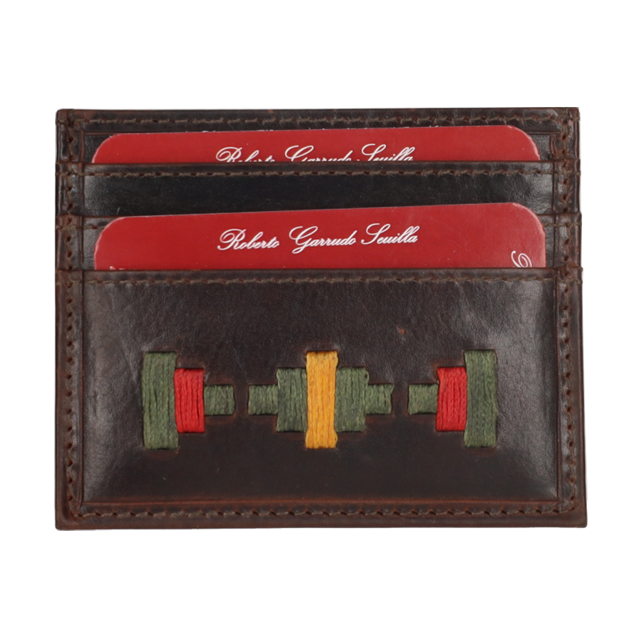 Leather card holder with ethnic embroidery in green, red, and mustard colors. It has several compartments inside for cards.