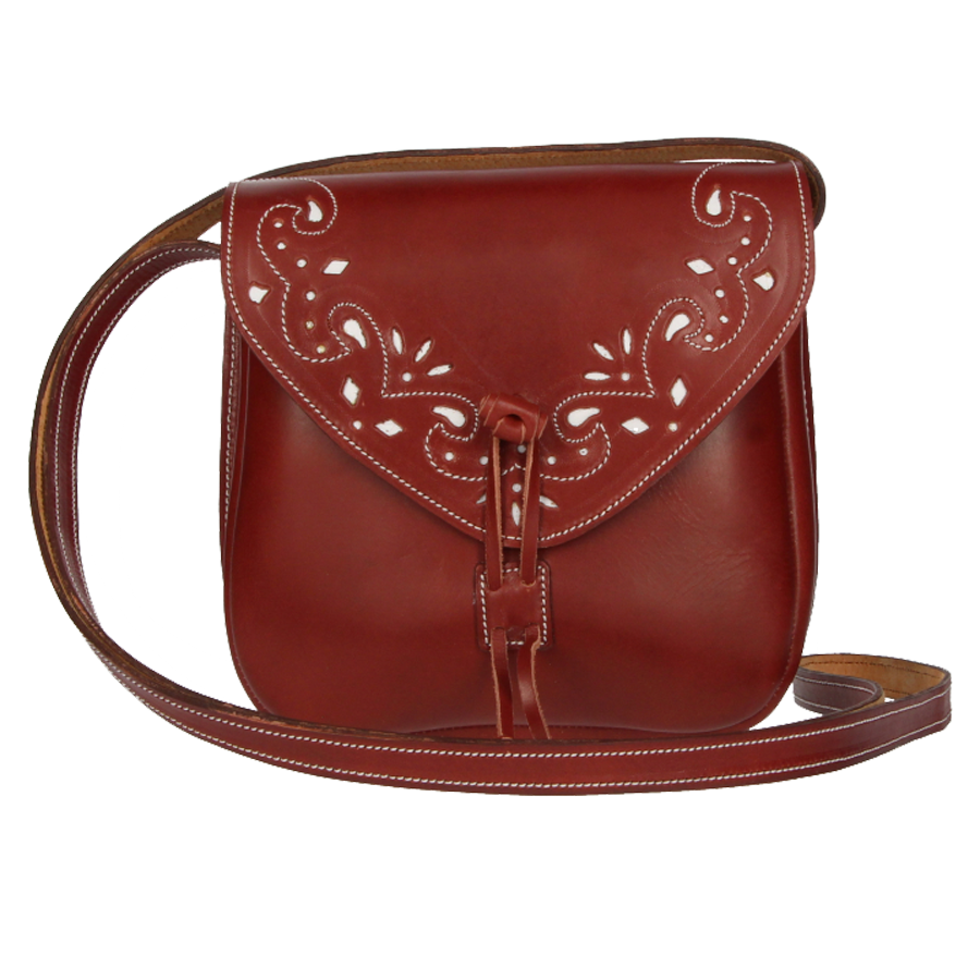 Sac bandoulière en cuir foncé, réalisé en veau huilé. Garniture en cuir trempé sur fond blanc. Bandoulière incluse.