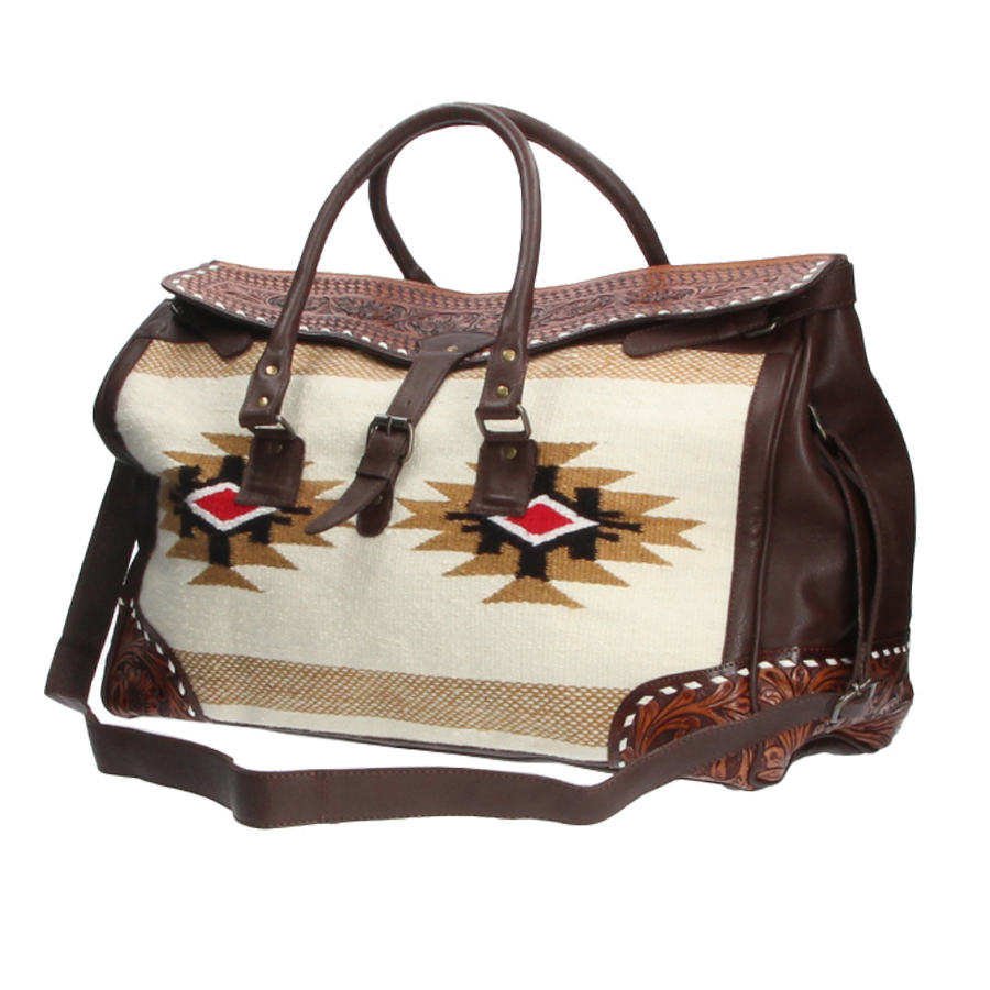 Sac de voyage ethnique avec fermoir. Sac de grande capacité, en cuir. Dimensions : 42 cm de large, 17 cm de profondeur, 30 cm de haut.