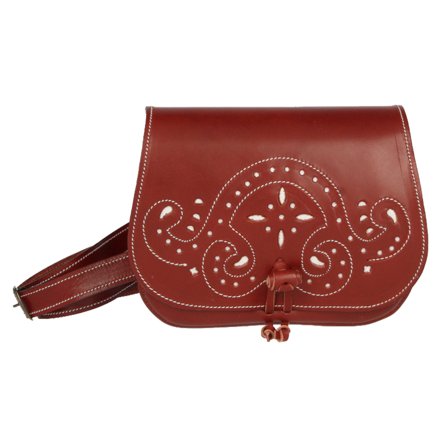 Petit sac Rociero en cuir de vachette foncé. Bandoulière incluse.