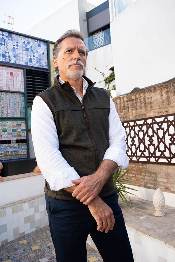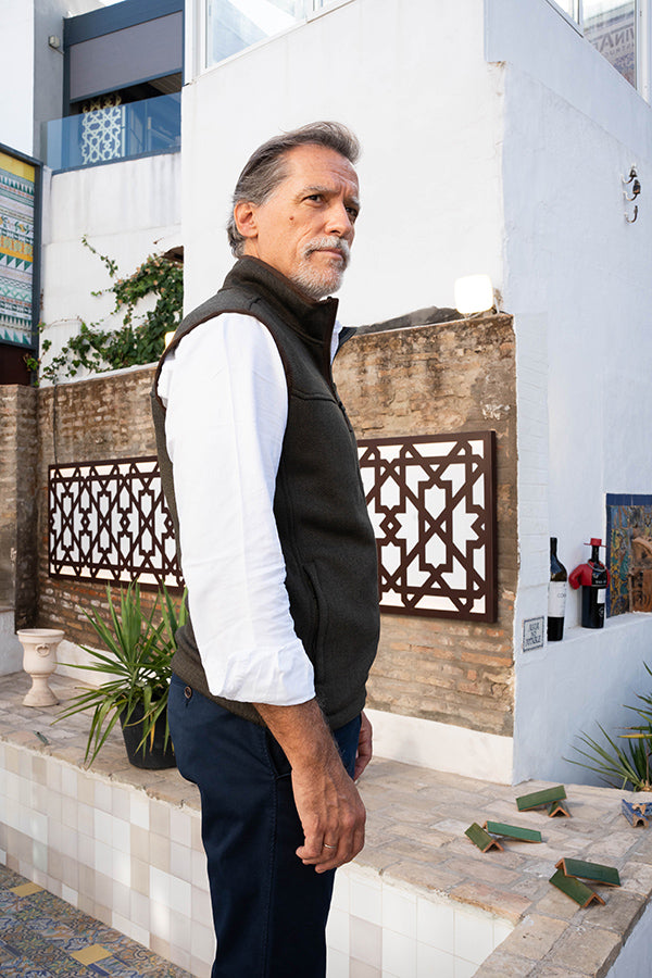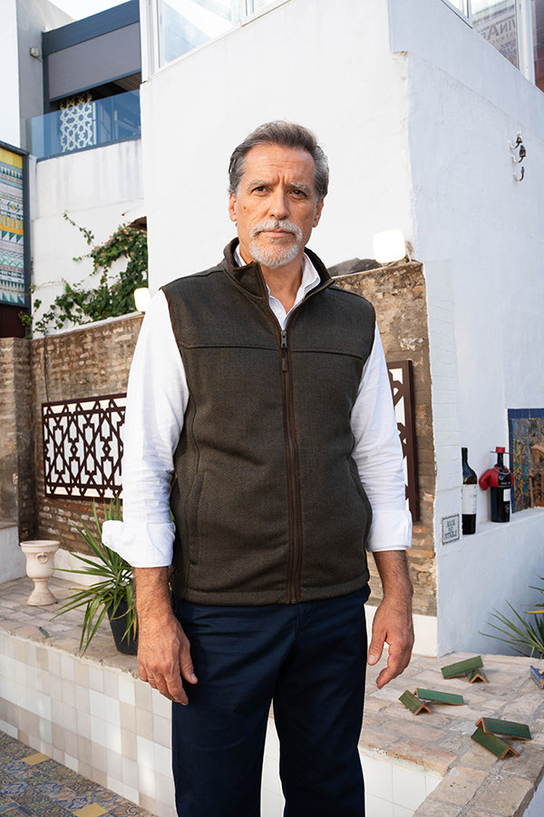 Gilet sans manches en polaire Roberto Garrudo à motif chevrons vert. Fermeture zippée. Poches incluses.