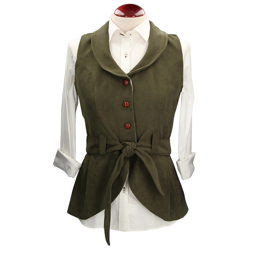 Gilet en suédine pour femme, modèle Pandora de Claudia Baelo, vert. Avec ceinture. Fait main. Fermeture boutonnée.