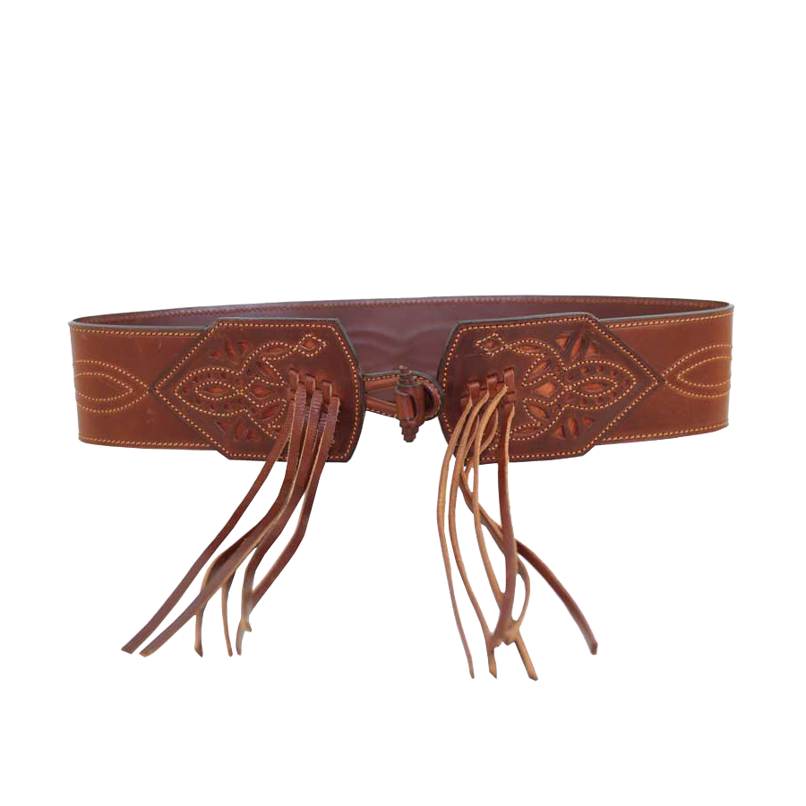 Ceinture chartreuse pour femme, couleur cuir, fond foncé, à franges, fabriquée à la main. Valverde del Camino