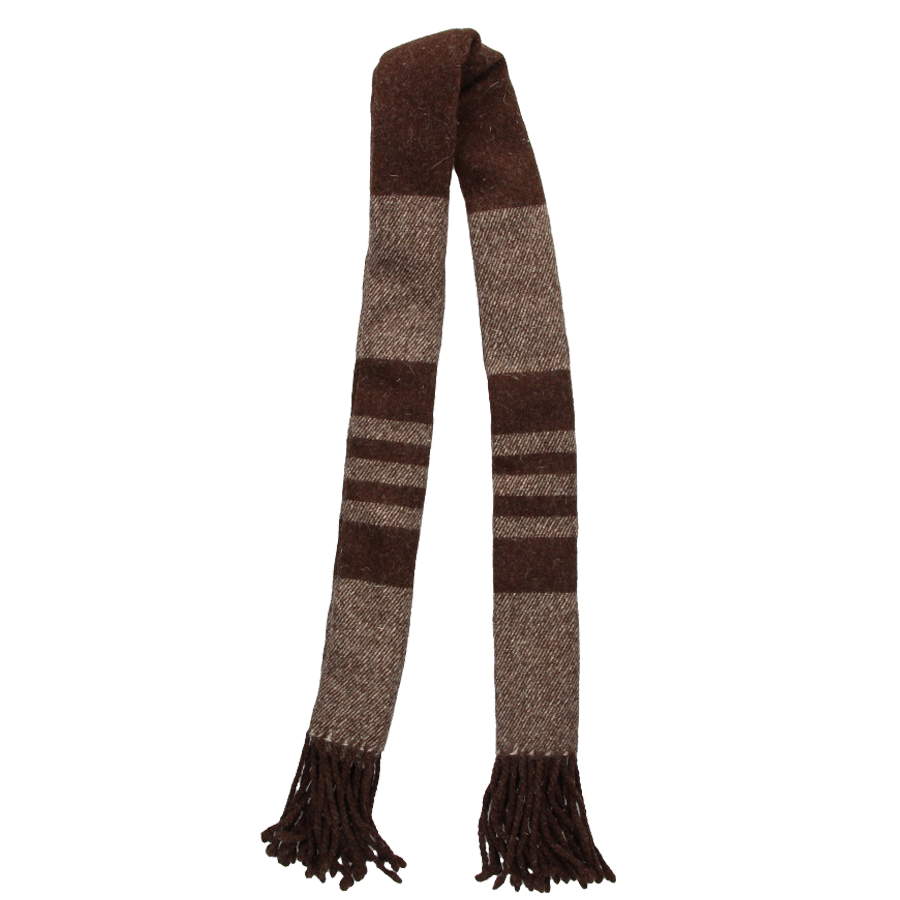 Couverture repose-pieds en chêne, cousue, à chevrons en marron foncé avec rayures.