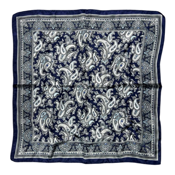 Écharpe en polyester à motif cachemire bleu marine, dimensions 53 x 53 cm