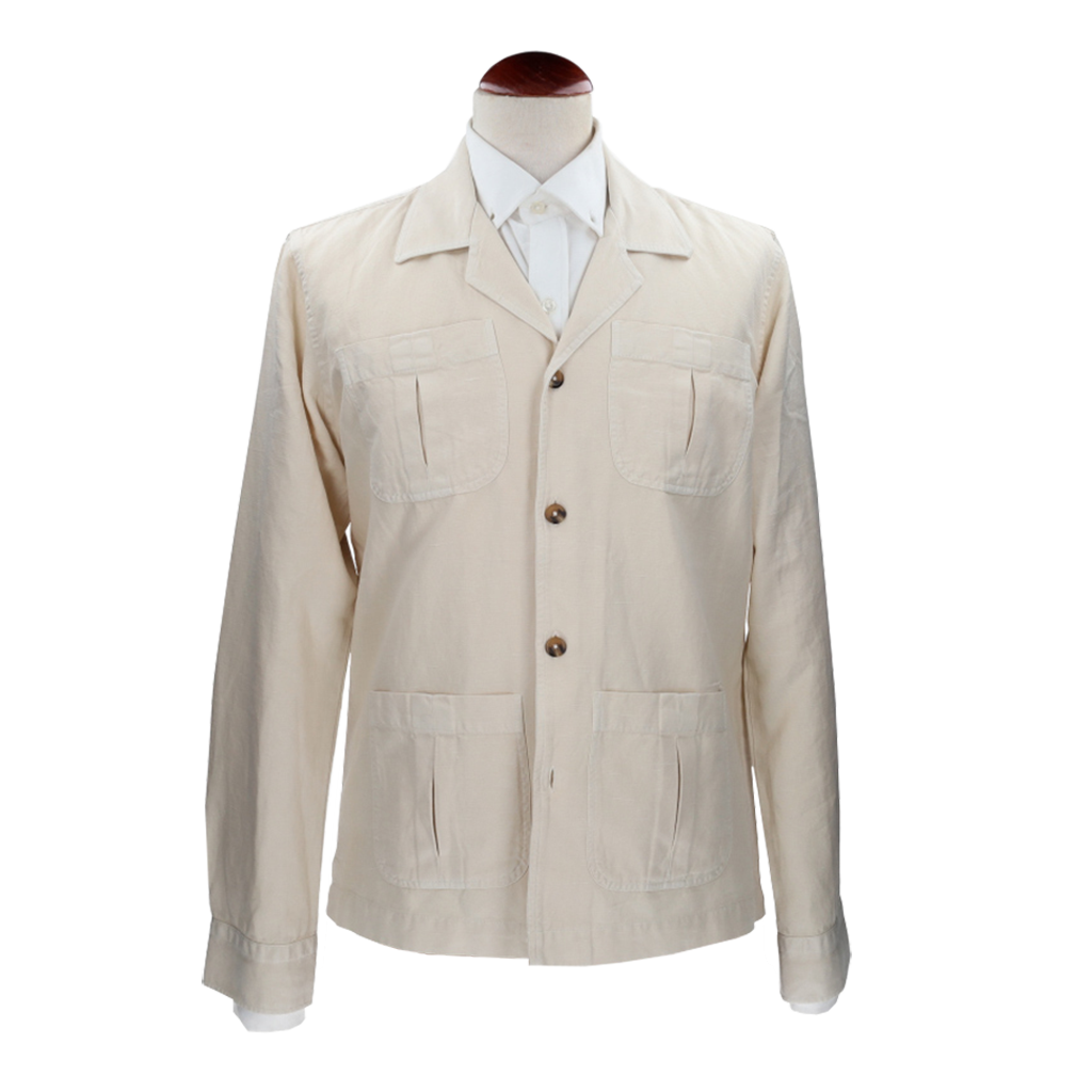 Veste safari beige. Poches extérieures. Composition : 55 % lin et 45 % coton. Tailles : 2/S, 3/M, 4/L, 5/XL, 6/2XL, 7/3XL et 8/4XL