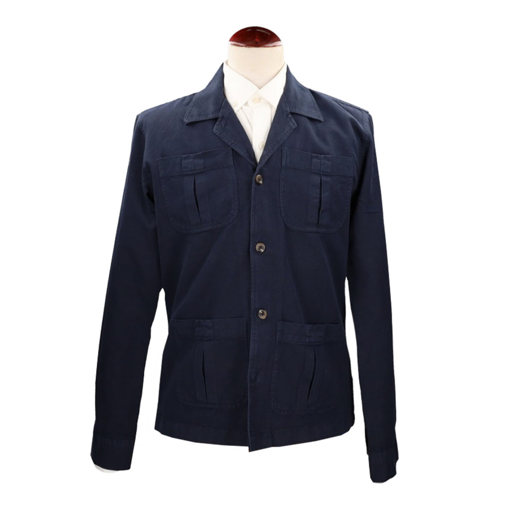 Veste safari bleu marine. Poches extérieures. Composition : 55 % lin, 45 % coton. Tailles : 2/S, 3/M, 4/L, 5/XL, 6/2XL, 7/3XL et 8/4XL