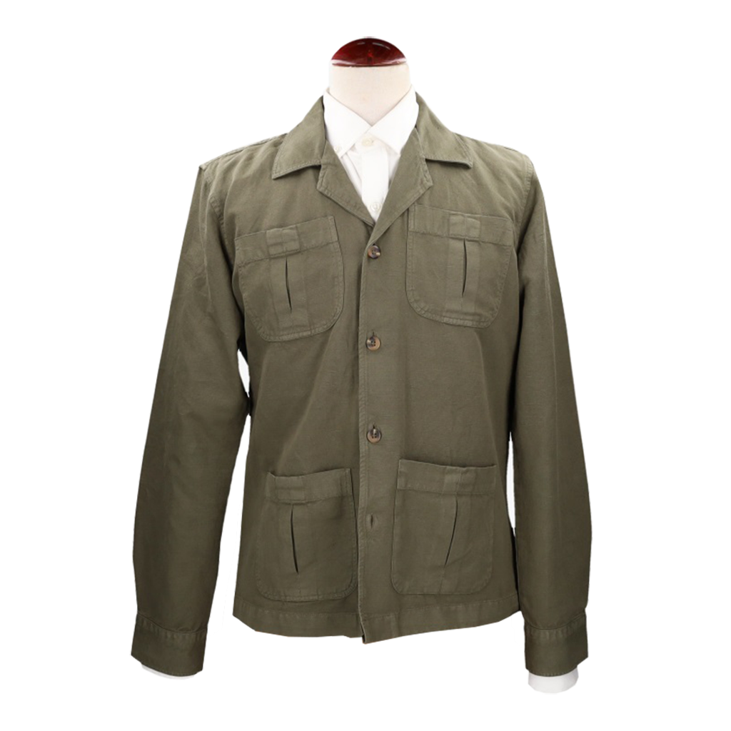 Veste safari verte. Poches extérieures. Composition : 55 % lin et 45 % coton. Tailles : 2/S, 3/M, 4/L, 5/XL, 6/2XL, 7/3XL et 8/4XL
