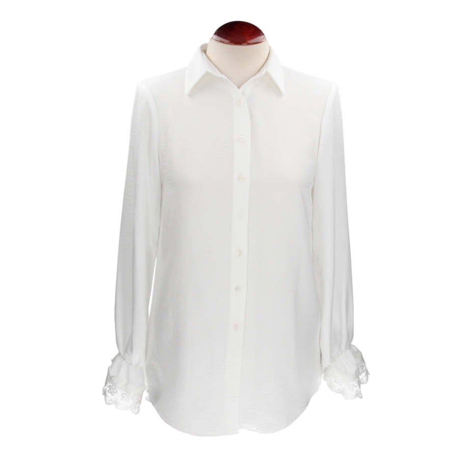 Camisa blanca con botones, con adornos de encaje en las mangas.. Composición 100% algodón. Lavado a máquina a 30º como máximo de temperatura, planchar a baja temperatura, no usar secadora, no blanquear.