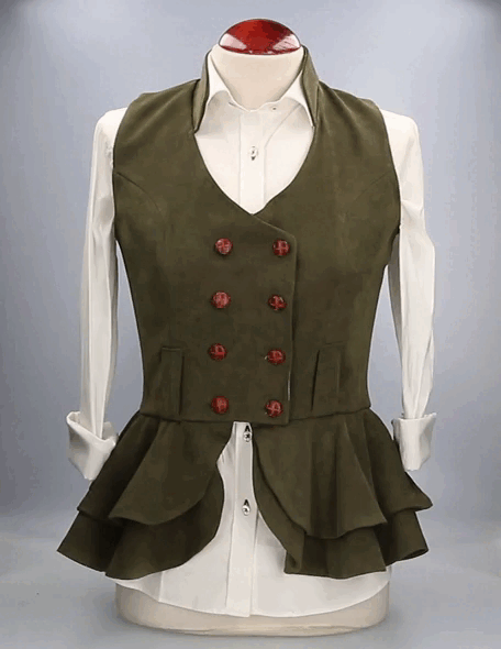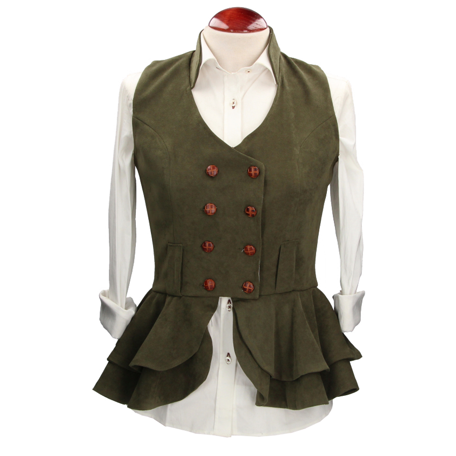 Chaleco de mujer, de la marca Claudia Baelo, modelo Galatea, tejido antelina, en color verde. Con trabillas para el cinturón. Cierre con botones. Con volantes. Composición: 97% poliéster 3% licra.