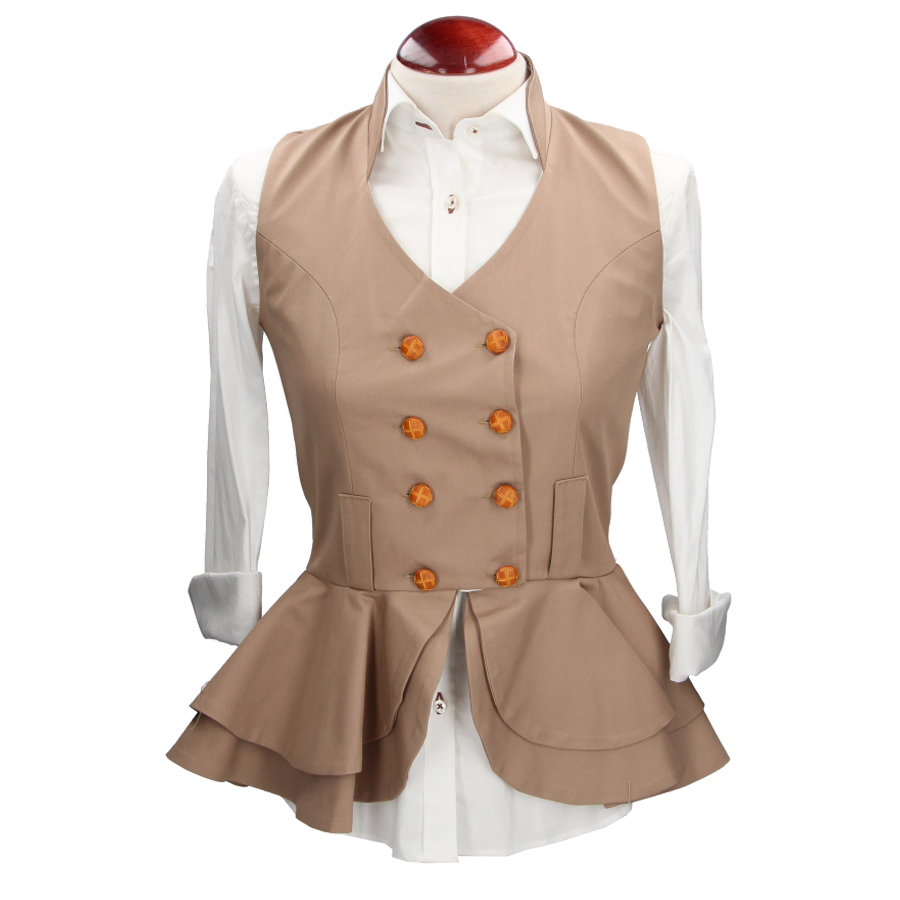 Chaleco de mujer, de la marca Claudia Baelo, en color camel. El cierre es con botones
