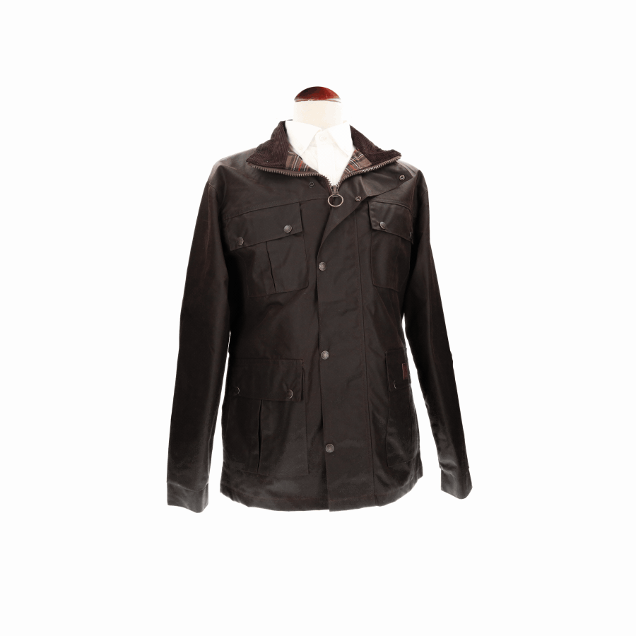 Chaqueta de hombre en algodón encerado. Consta de 4 bolsillos, 2 inferiores más 2 superiores, ambos con tapeta y cierre con broches. Cierre central con cremallera metálica y broches. Cuello en micropana. Forro interior en poliester tipo cuadro escocés.