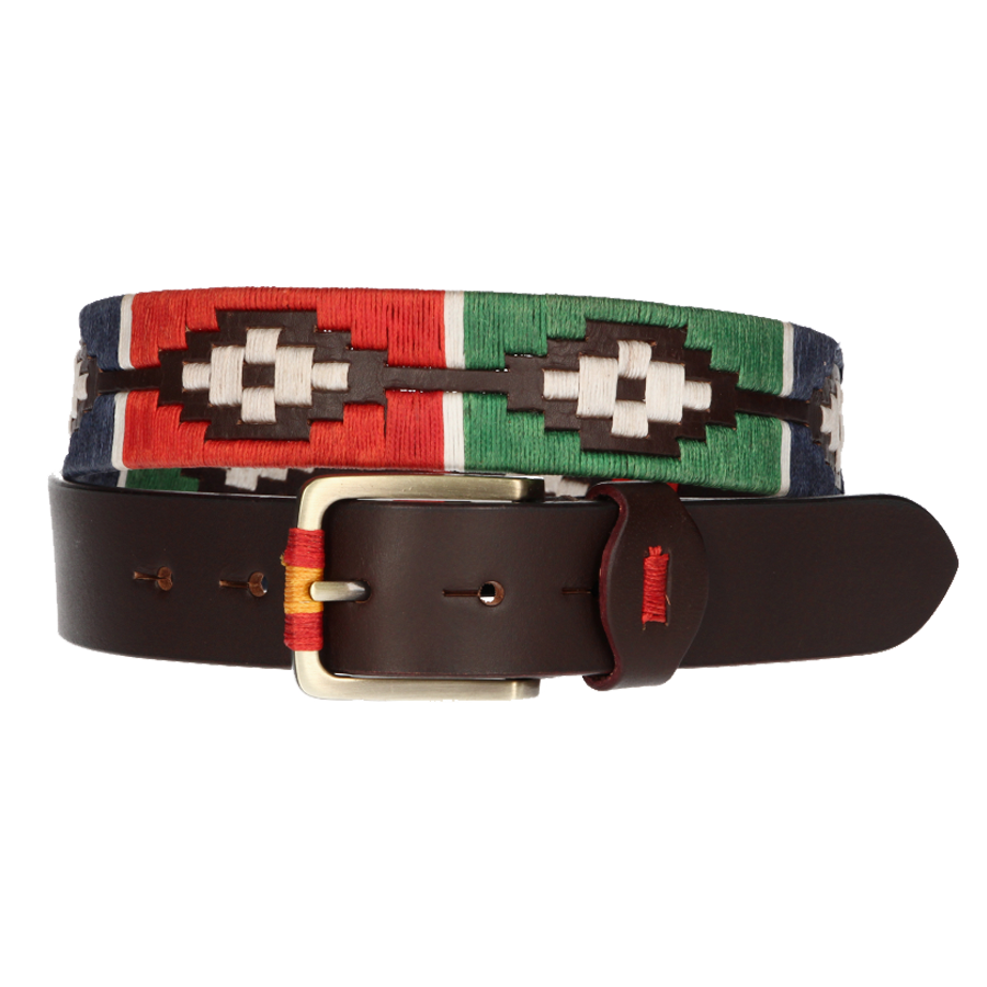 Cinturón de piel unisex con bordado en color azul, rojo y verde.
