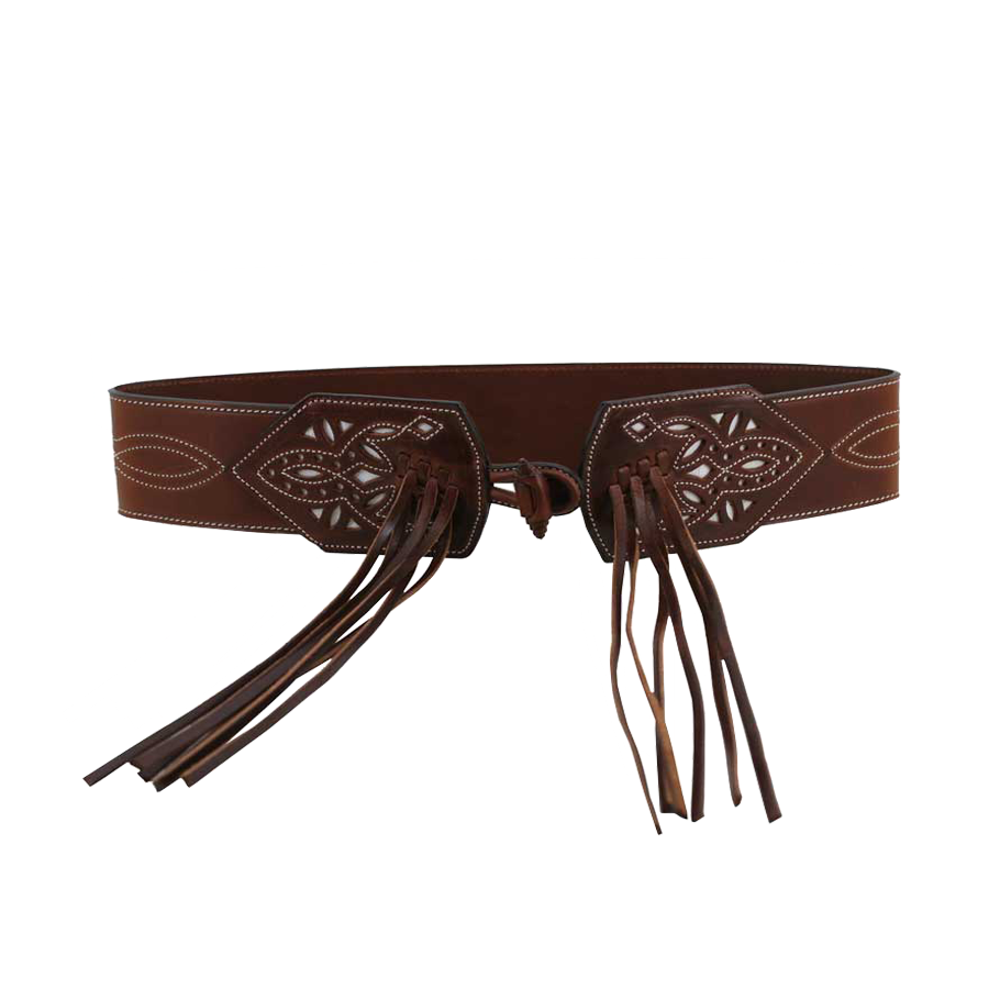 Cinturón cartujano de señora, color cuero oscuro, fondo claro, con flecos, hecho a mano. Valverde del Camino