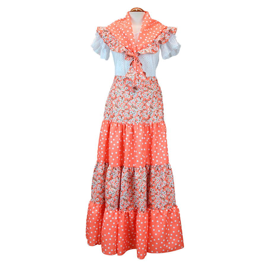 Conjunto de falda y piquillo modelo "Amapola". Con tonos en color salmón y lunares combinada con flores. El piquillo trae incorporado el lazo para amarrarlo sin imperdible.