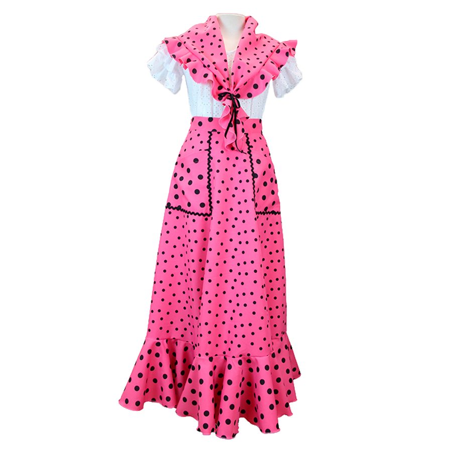 Conjunto de falda y piquillo modelo "Jara". Con tonos en color fucsia y lunares negros. Tiene dos bolsillos grandes en la parte delantera. El piquillo trae incorporado el lazo para amarrarlo sin imperdible.