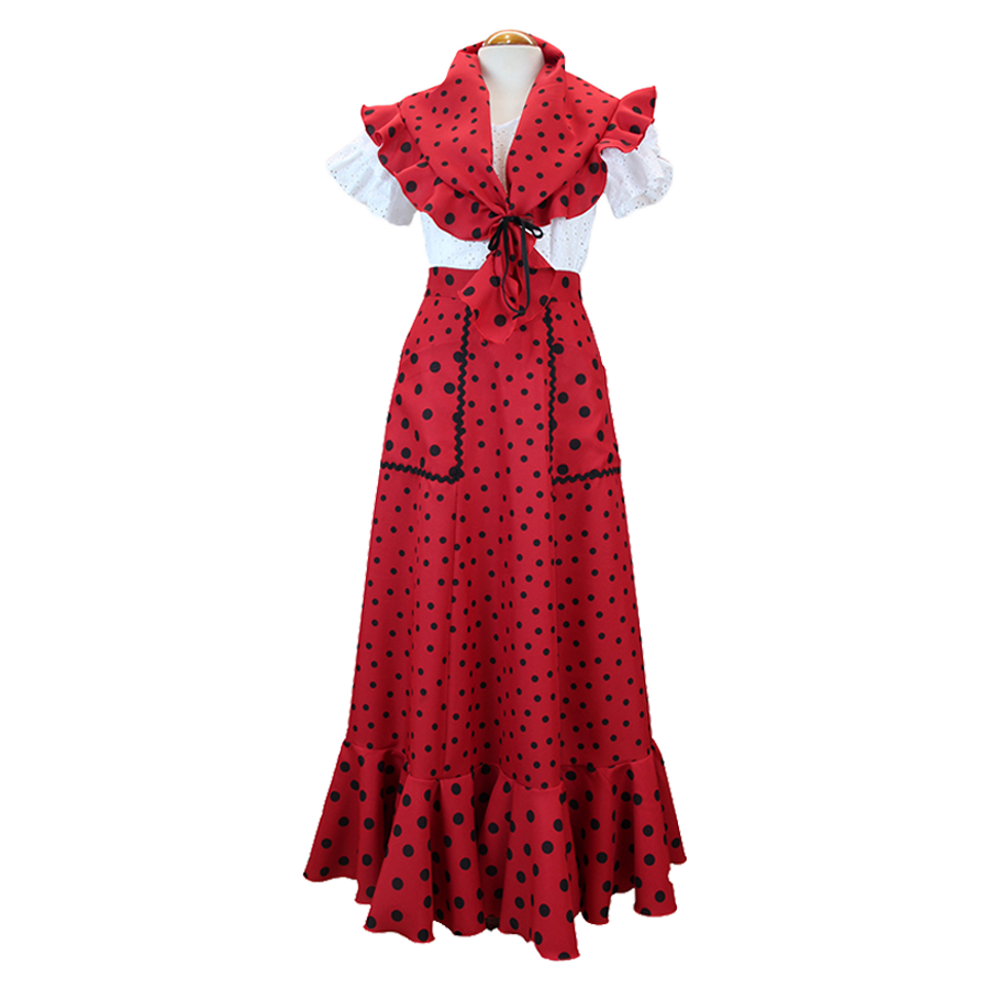 Conjunto de falda y piquillo modelo "Jara". Con tonos en color rojo y lunares negros. Tiene dos bolsillos grandes en la parte delantera. El piquillo trae incorporado el lazo para amarrarlo sin imperdible.